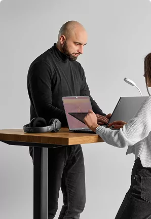 Робочі столи з регулюванням висоти підвищують продуктивність команди на 66% з уникненням лікарняних через проблеми зі спиною. Важлива складова сучасного корпоративного іміджу й турботи про співробітників. Діють спеціальні знижки на групові замовлення від 5 столів