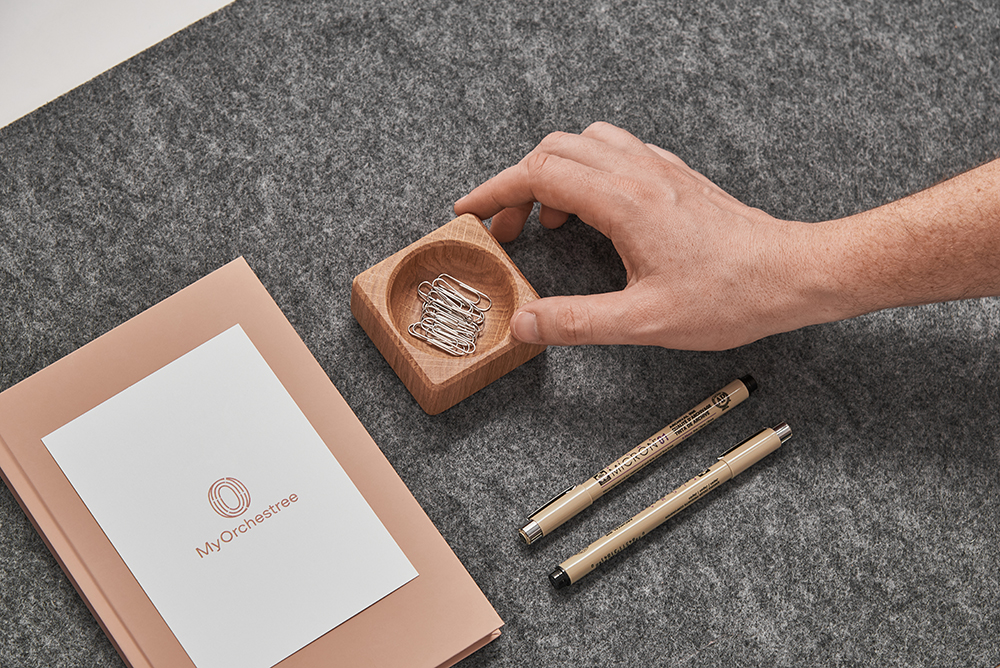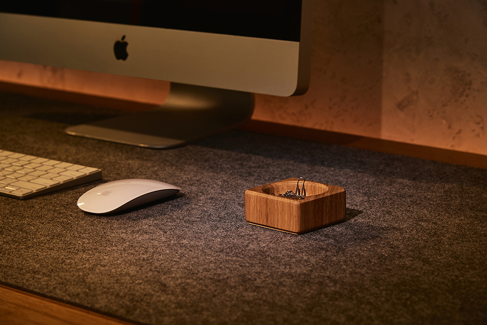 Details set the tone for the workplace. Stylish desk dish No.1 is for storing small office supplies. The oakwood surface of the stand is treated with oil. Another natural material used is cork grown in Portugal. The cork layer on the bottom base of the product gives it stability and protects it from damage.