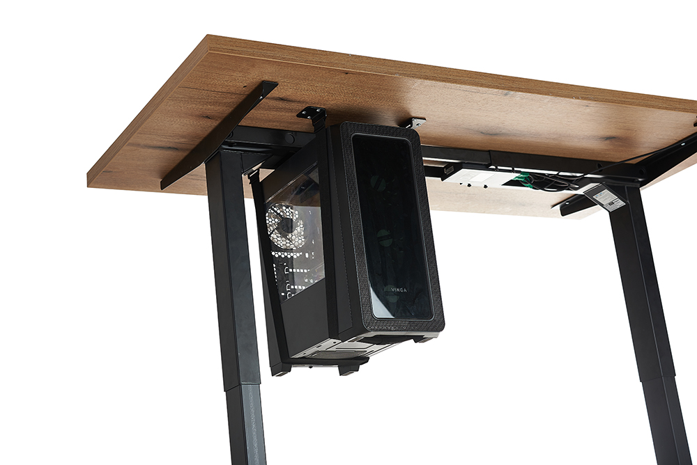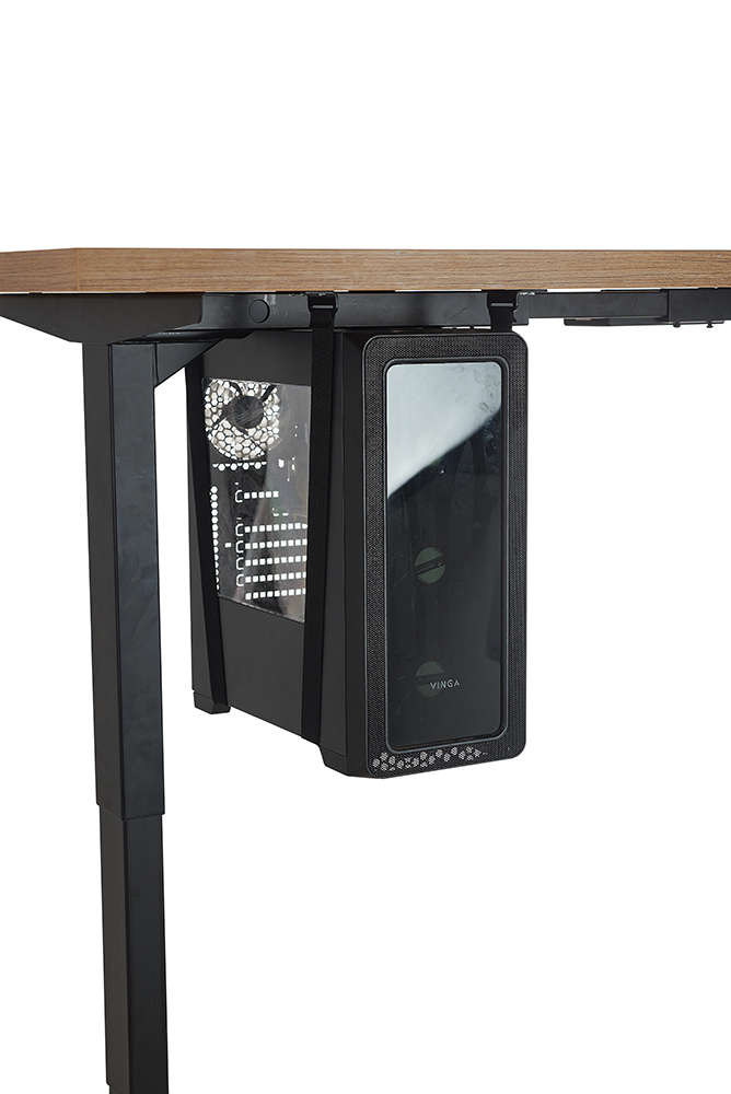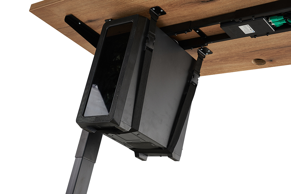 Universal mount for a system unit that fits most types of desktop PCs. Made from durable straps, buckles, and steel profiles. Easily mounts to the desktop with screws included in the supply kit. The straps are easily adjustable and securely fix the PC. The mount is suitable for height-adjustable desks, helps improve cable management, and optimizes desk space.