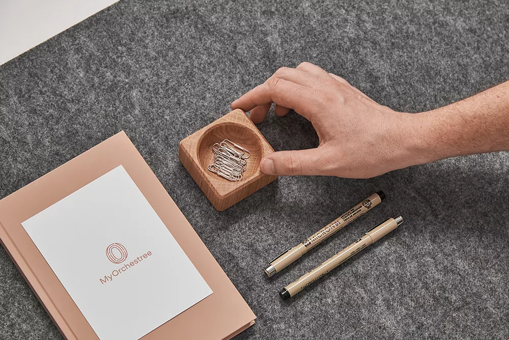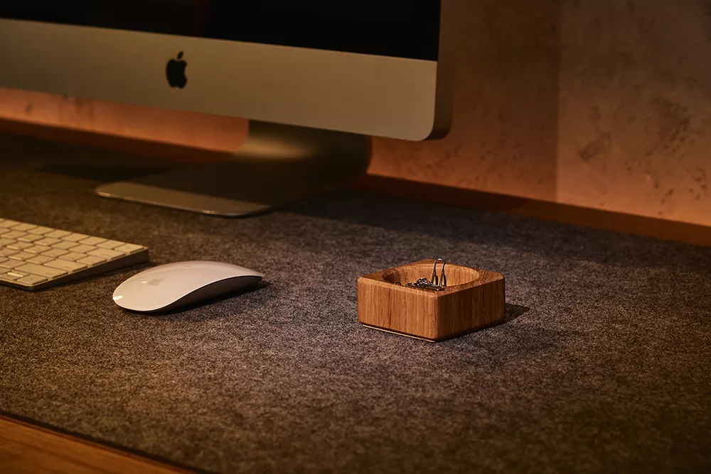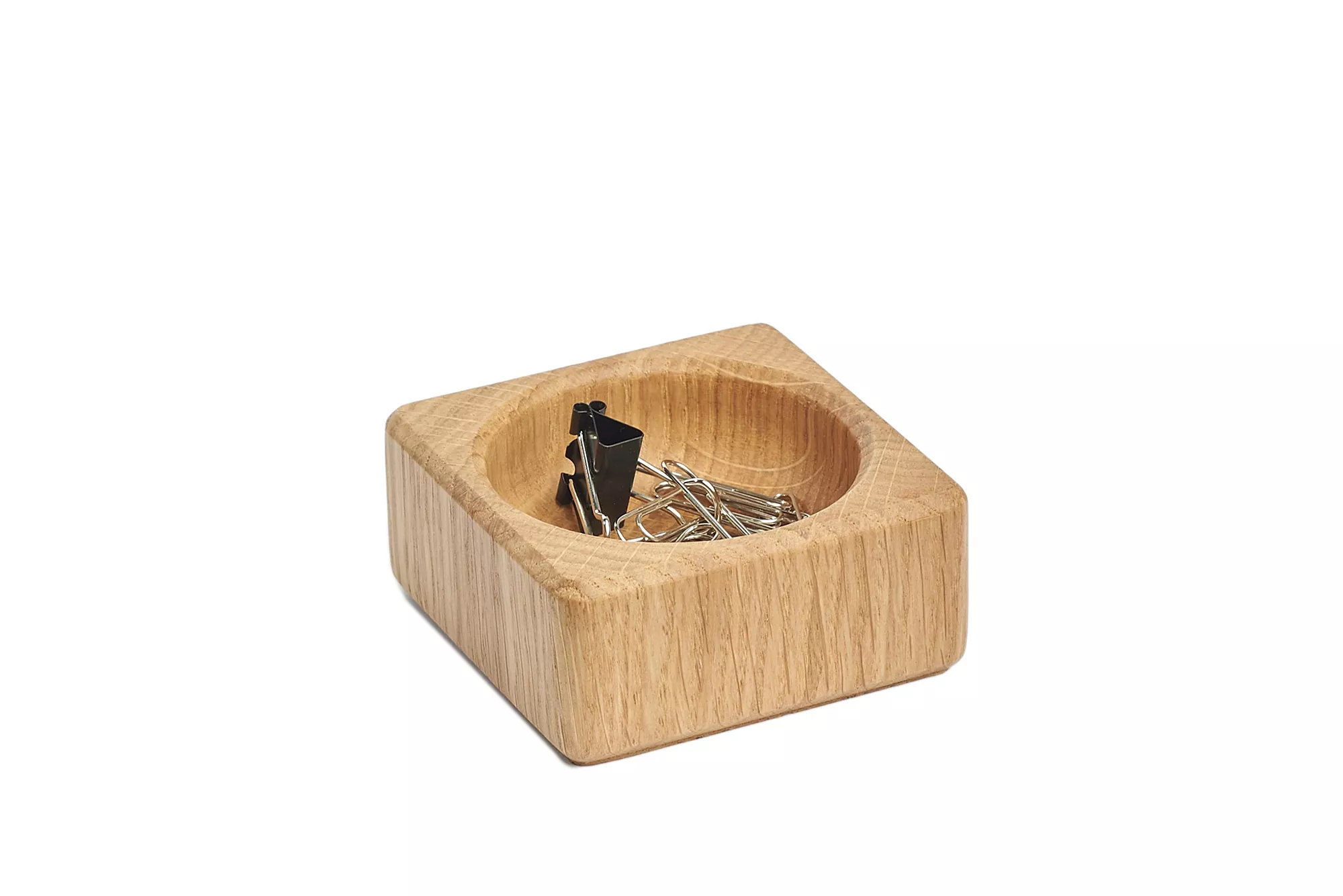 Робочому місцю тон задають деталі. Стильна підставка No.1 — елемент набору, призначений для зберігання дрібного канцелярського приладдя. Виконана з дубової деревини поверхня підставки оброблена олією. Ще один використаний природний матеріал — корок, вирощений у Португалії. Корковий шар на нижній основі виробу надає йому стійкості та захищає від пошкоджень.