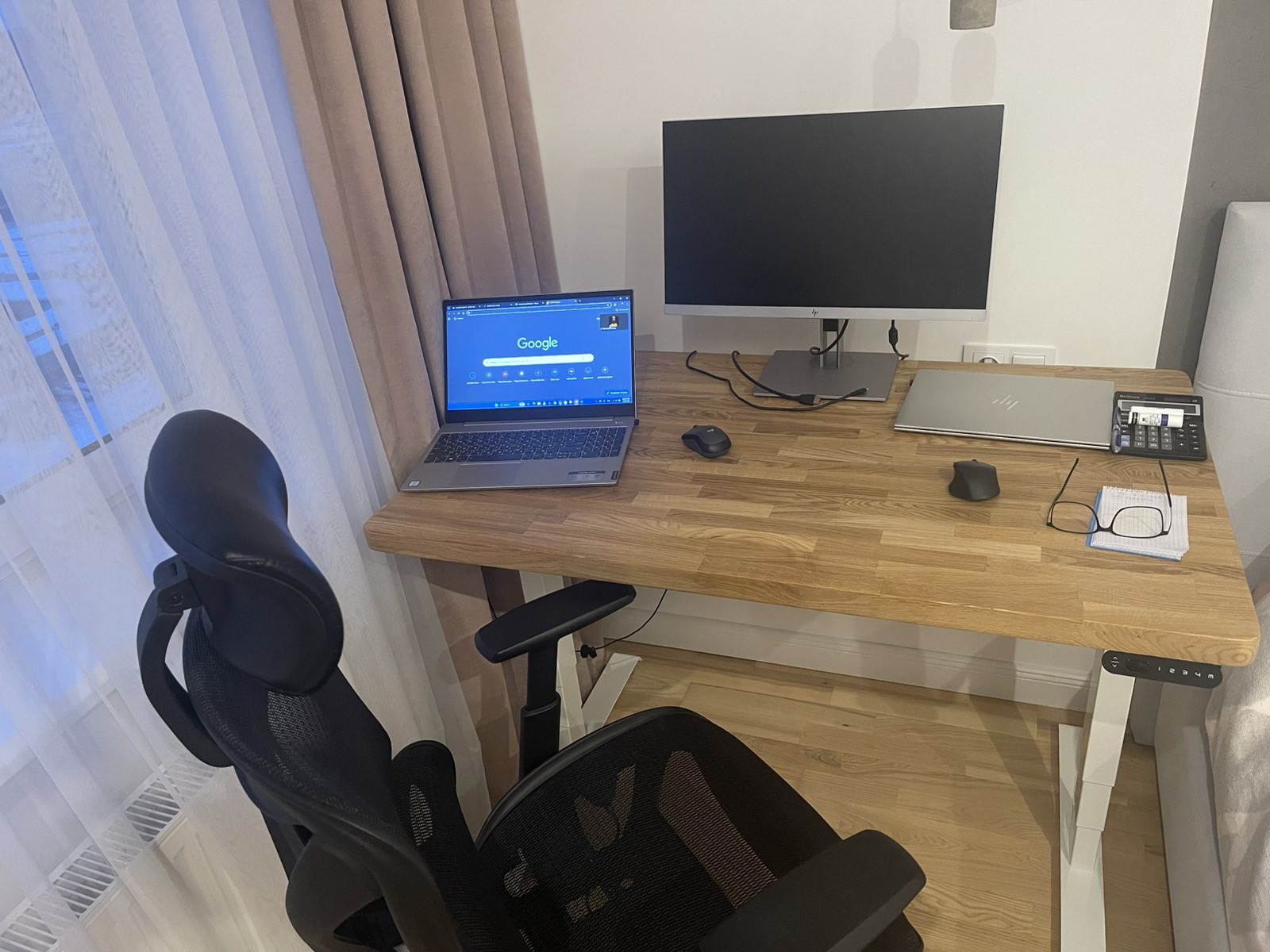 Стіл розміром 1400×800 мм, з дубового масиву, модель з регулюванням висоти PRO. Уже з першого дня відчувається якість у кожній деталі. Масив дуба виглядає дуже солідно, приємний на дотик, з гарною текстурою — не просто робочий стіл, а повноцінний елемент інтер’єру. Видно, що матеріал не економили і обробка зроблена на совість.