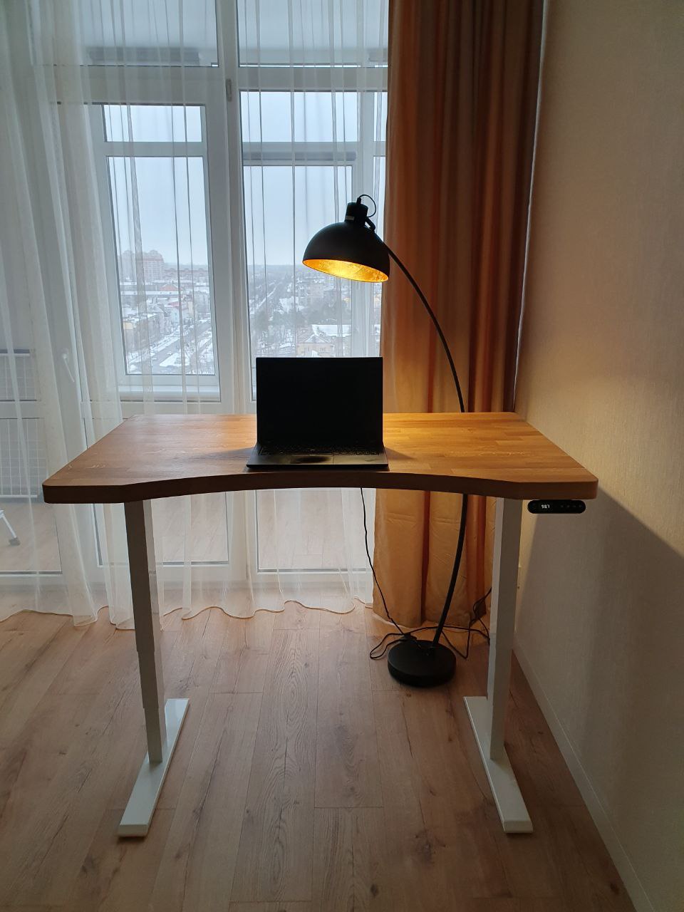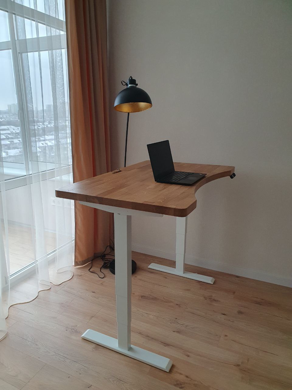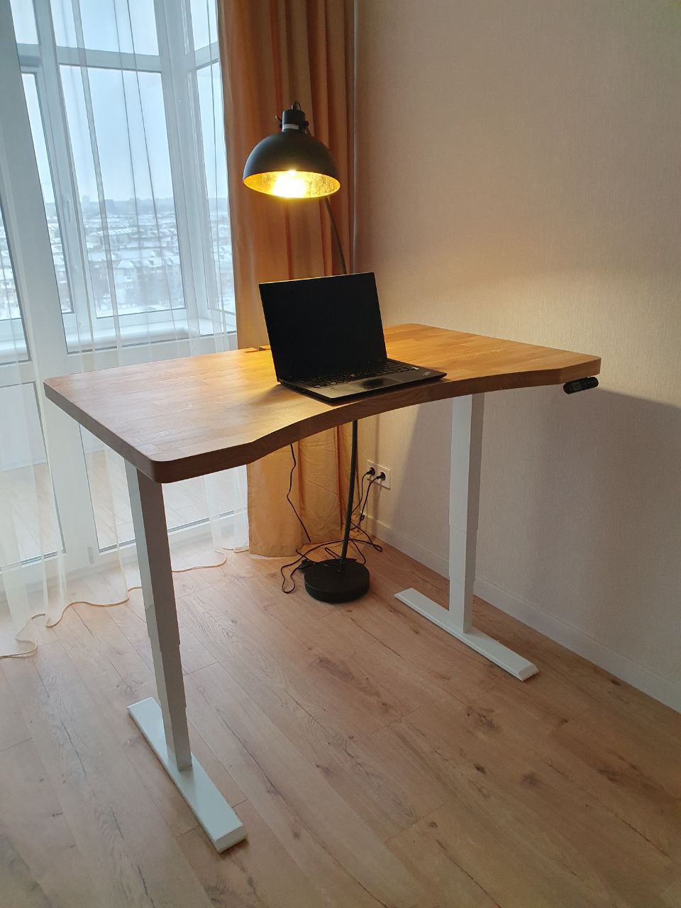 Ідеально вписався в інтер‘єр. Масивні стійки, могутня дубова стільниця додають непохитності і впевненості в роботі. Замовив додатково T-виріз і органайзер для кабелів – дозволяють сховати весь «дротовий безлад». Стільницю взяв ширшу (800-ку), люблю коли на столі багато місця. Дуже переймався за якість поверхні (хотілось максимально відчувати дерево), та зараз можу з впевненістю сказати, що задоволений на всі 100%. Для тих, в кого багато статичної роботи – ідеальний варіант.