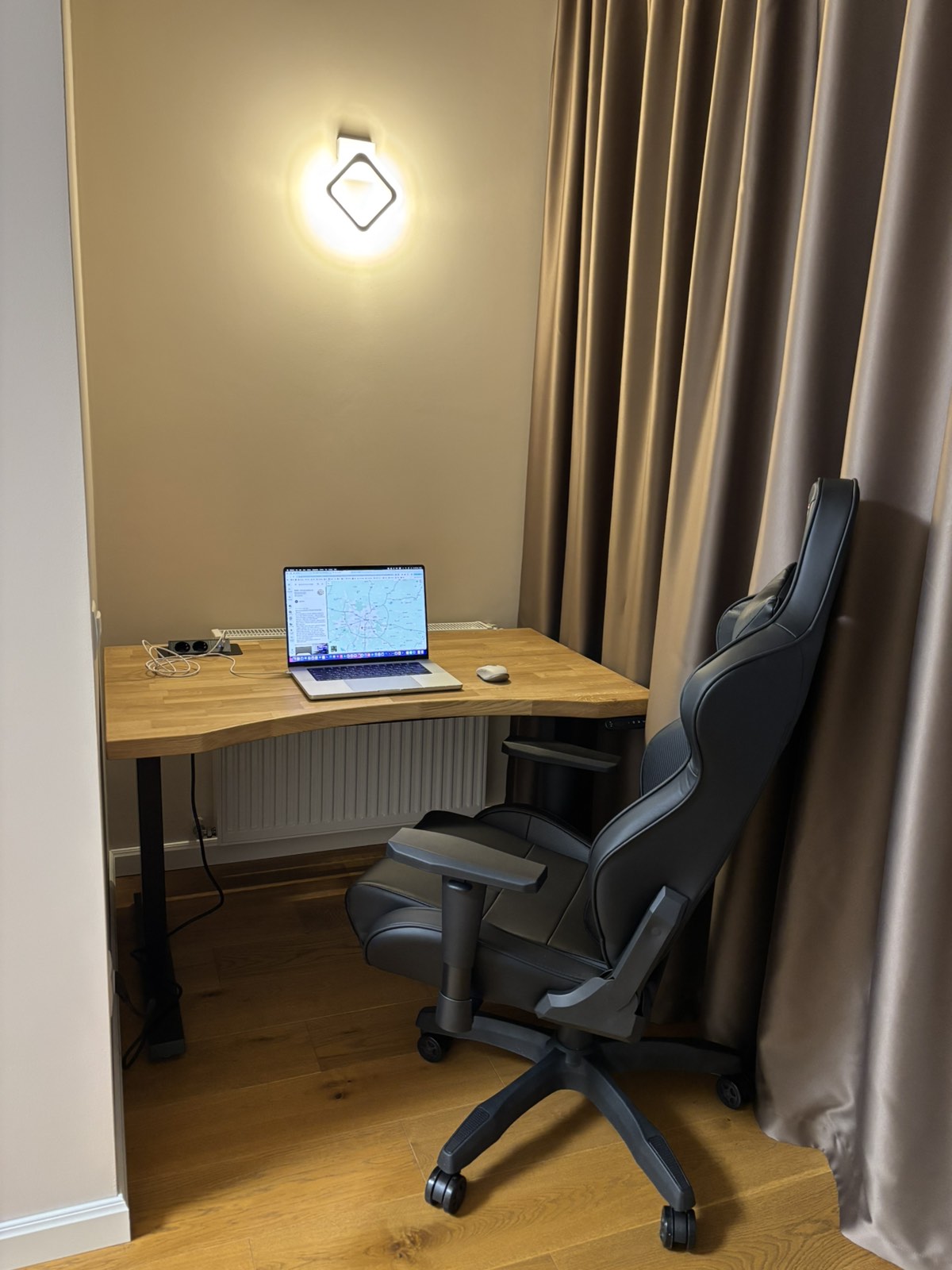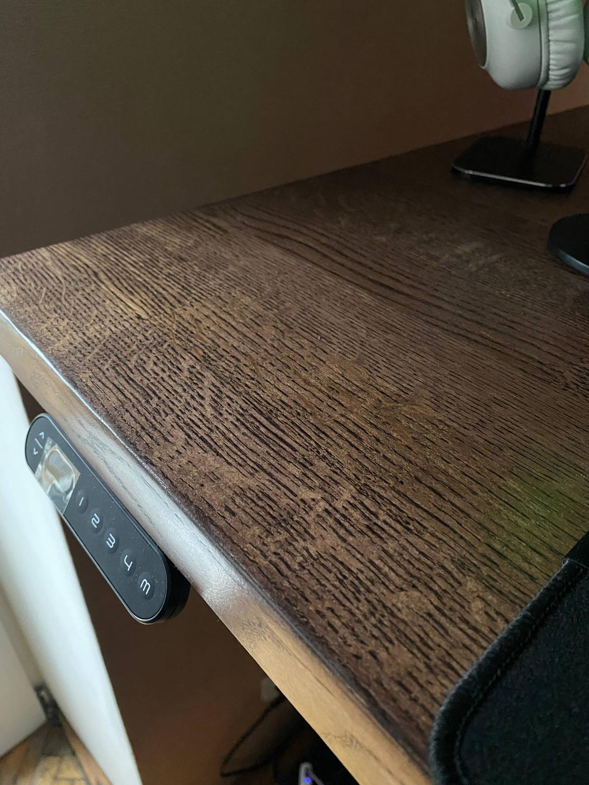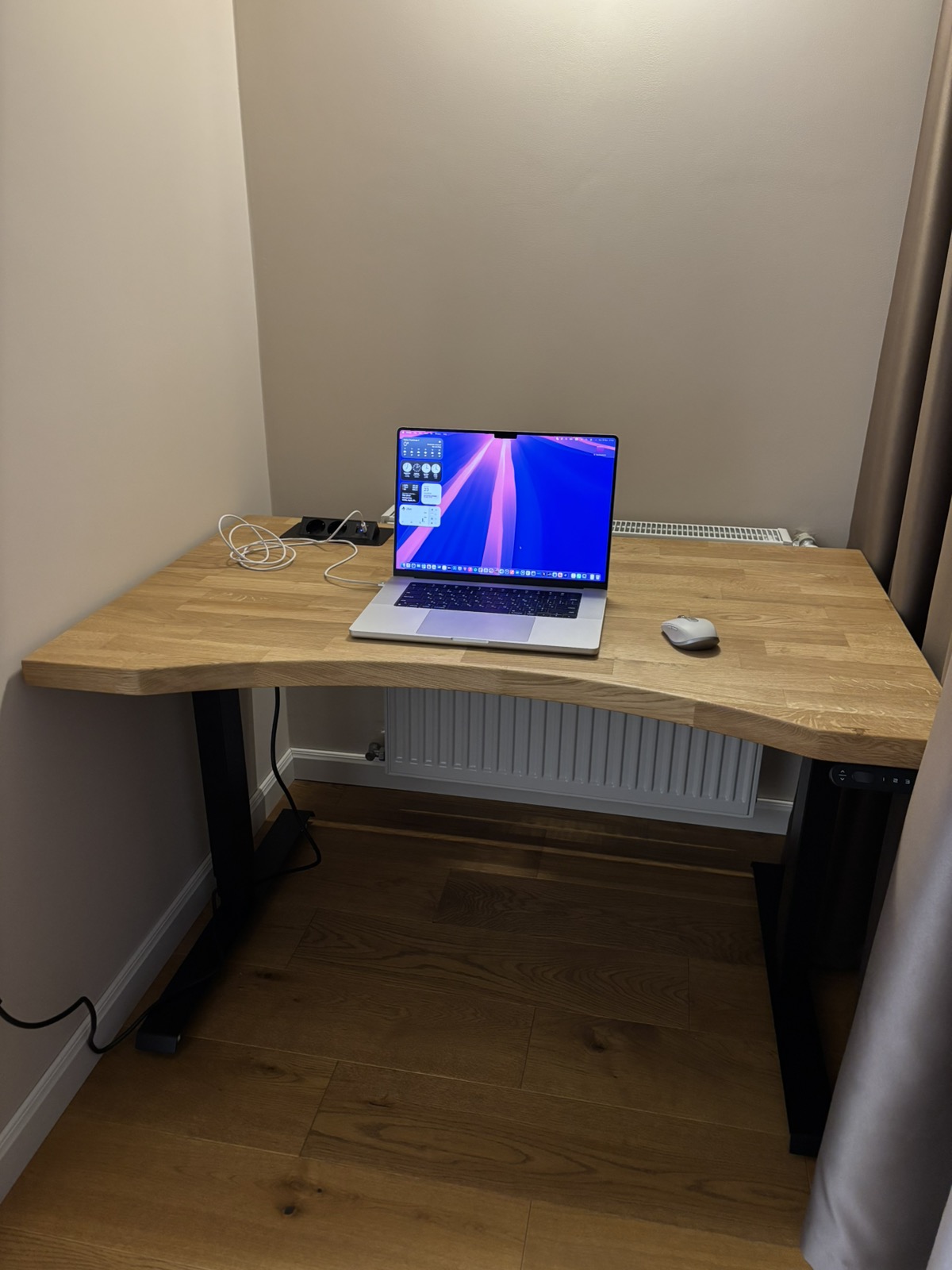 Ідеально вписався в інтер‘єр. Масивні стійки, могутня дубова стільниця додають непохитності і впевненості в роботі. Замовив додатково T-виріз і органайзер для кабелів – дозволяють сховати весь «дротовий безлад». Стільницю взяв ширшу (800-ку), люблю коли на столі багато місця. Дуже переймався за якість поверхні (хотілось максимально відчувати дерево), та зараз можу з впевненістю сказати, що задоволений на всі 100%. Для тих, в кого багато статичної роботи – ідеальний варіант.