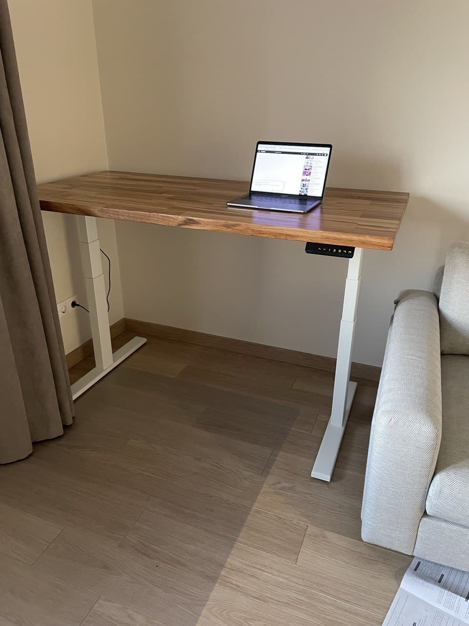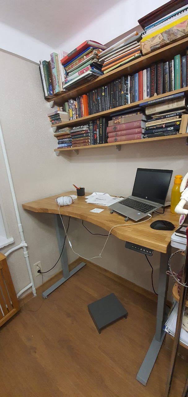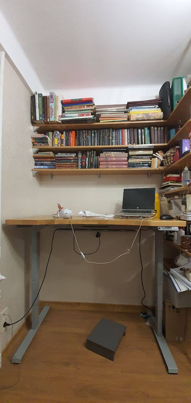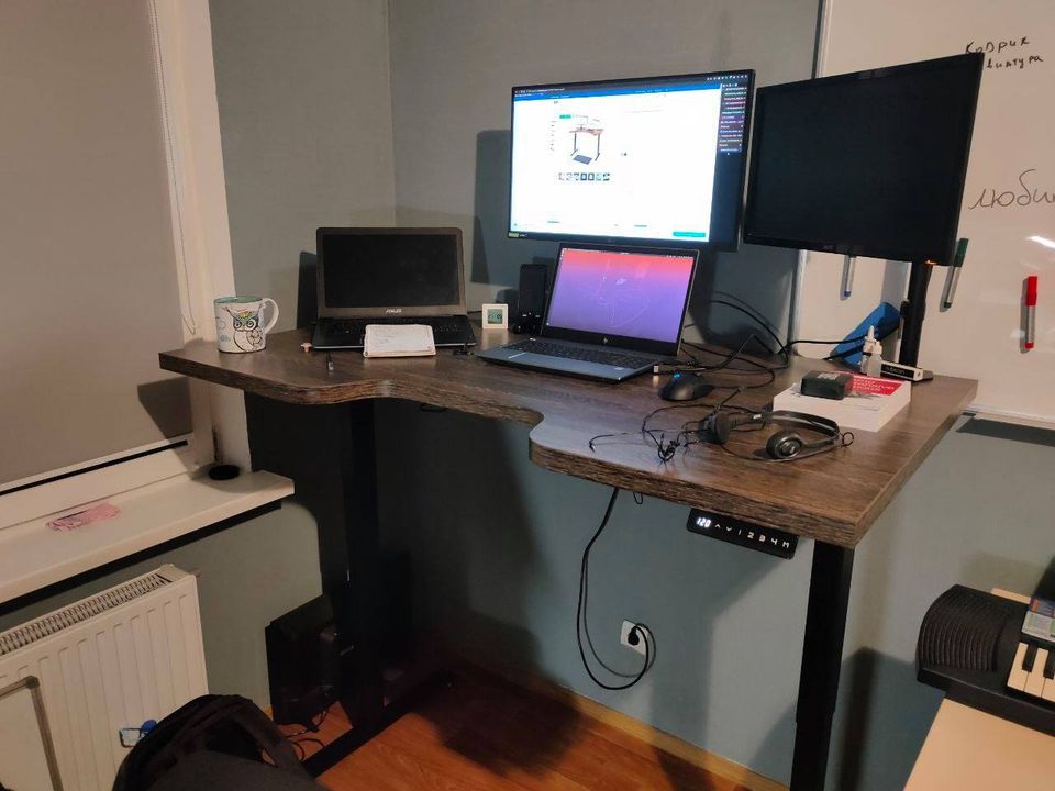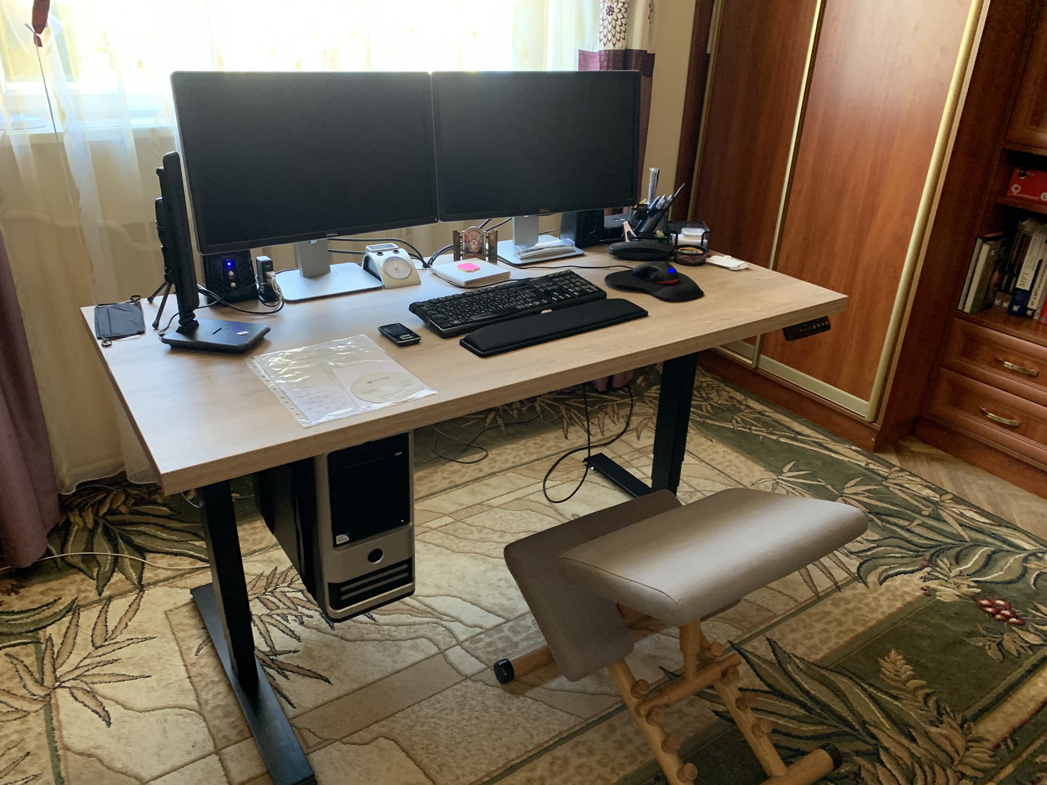 Відчуття від використання столу дуже круті – він масивний, надійний, не хитається. Коли стоїш, можна на нього спертись і не переживати, що він перевернеться. Пульт дозволяє запам’ятати 4 положення висоти і переключатись між ними, натиснувши одну кнопку. Тому переключаюсь я часто, як тільки виникає мінімальний дискомфорт від сидіння чи стояння. Сидіти за таким столом також зручніше, ніж за звичайним – завжди можна ідеально підлаштувати висоту під себе.