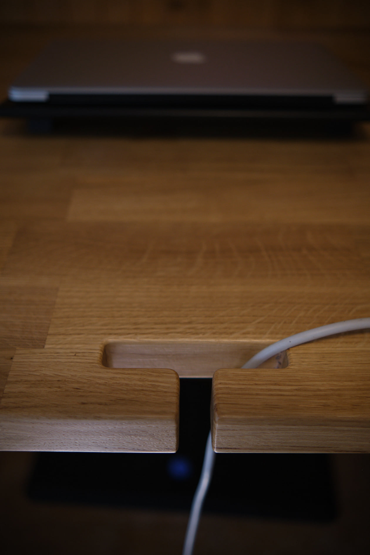 Ідеально вписався в інтер‘єр. Масивні стійки, могутня дубова стільниця додають непохитності і впевненості в роботі. Замовив додатково T-виріз і органайзер для кабелів – дозволяють сховати весь «дротовий безлад». Стільницю взяв ширшу (800-ку), люблю коли на столі багато місця. Дуже переймався за якість поверхні (хотілось максимально відчувати дерево), та зараз можу з впевненістю сказати, що задоволений на всі 100%. Для тих, в кого багато статичної роботи – ідеальний варіант.