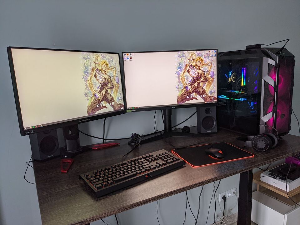 На столе спокойно поместились два монитора по 27 дюймов и сам пк. Достаточно качественный механизм , который за месяц эксплуатации не подвёл ни разу. Собирается стол довольно легко , имеется доступная видео-инструкция в интернете(не от производителя).