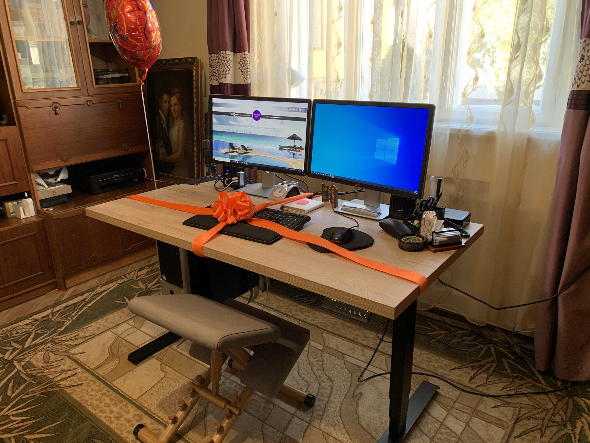 Не так давно, а именно 10 июня я приобрёл у вас стол для работы стоя. Такой же стол был у моего коллеги с прошлого проекта. Прошло всего две недели, но я уже с первого дня использования почувствовал себя комфортней во время работы. У меня две протрузии и сидеть по 8 часов было адом. Иногда я вставал и просто нагибался на обычным столом, так как задачи не ждут. Теперь же совмещаю работу сидя/стоя. По времени стою около 40 минут. Несколько раз за день. Отличное устройство за свои деньги. И за это вам ребята спасибо. Из минусов пока для себя вынес короткое расстояние для рук на первом этаже конструкции. У меня рост 190 и длина рук от локтя до кисти порядка 35 см. Положив кисть руки на клавиатуру её не произвольно хочется подвинуть вперёд, дабы локти не свисали. Но это чисто дело комфорта. А так всё отлично. Ещё раз спасибо.