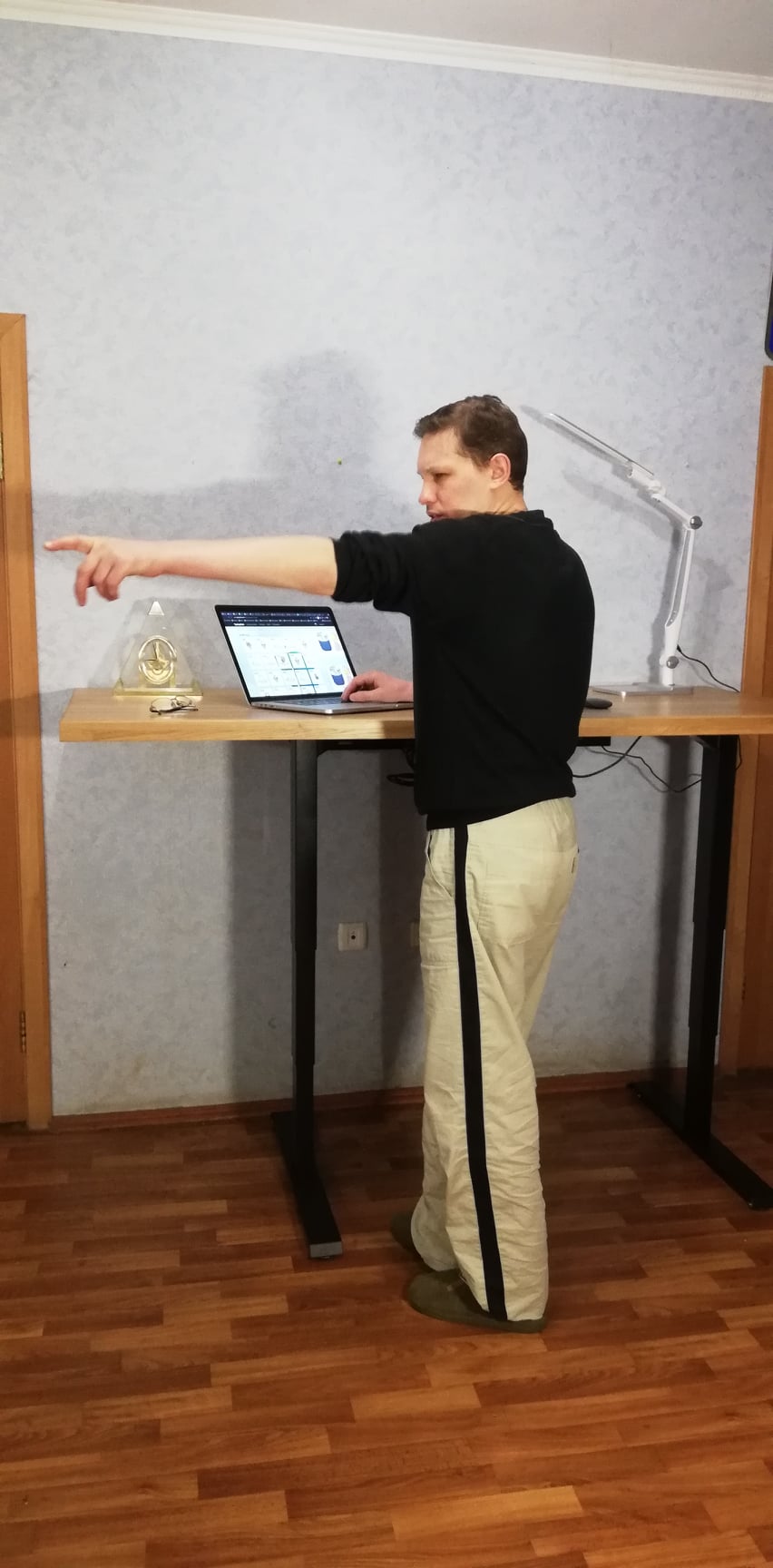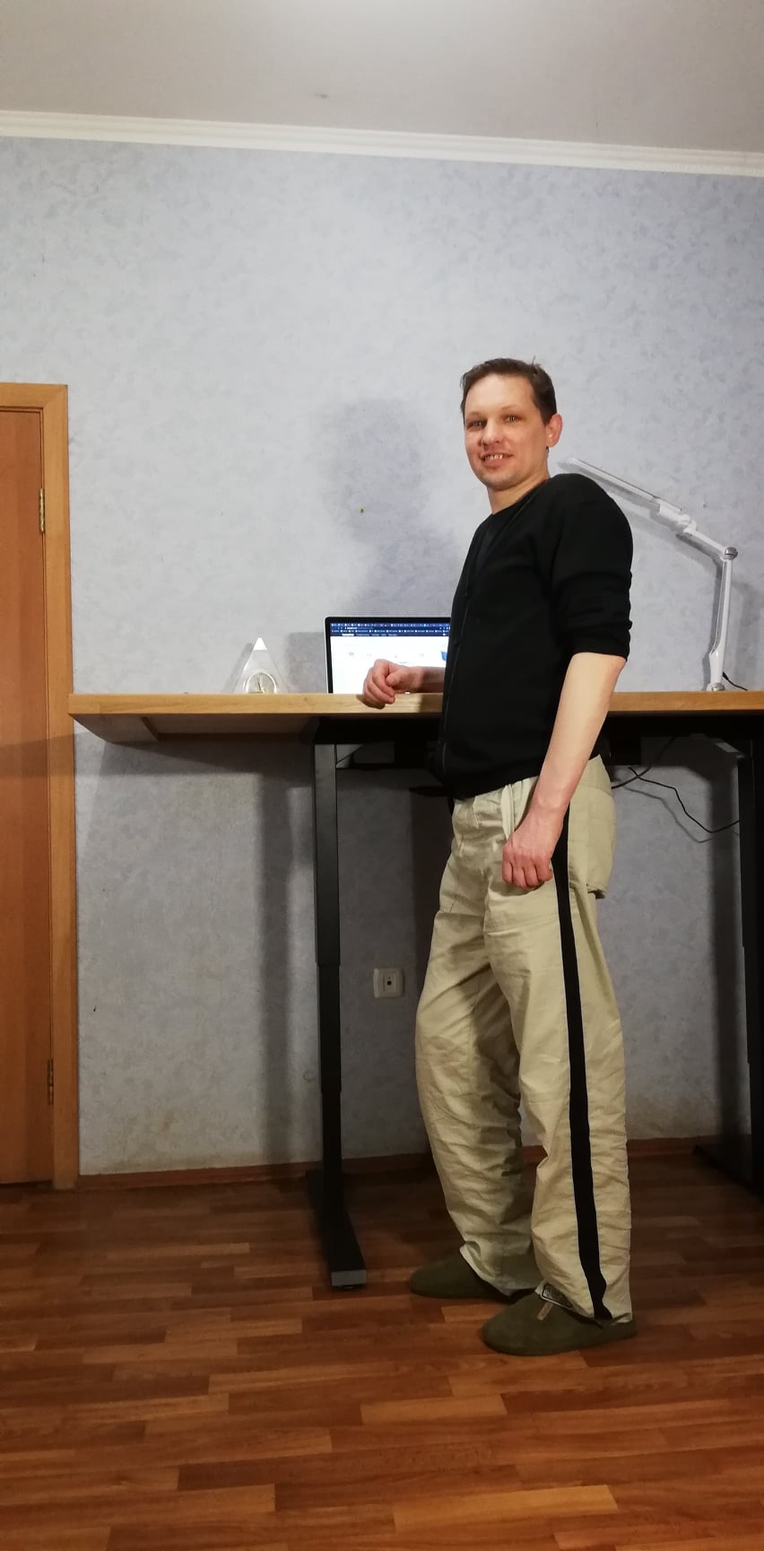 Не так давно, а именно 10 июня я приобрёл у вас стол для работы стоя. Такой же стол был у моего коллеги с прошлого проекта. Прошло всего две недели, но я уже с первого дня использования почувствовал себя комфортней во время работы. У меня две протрузии и сидеть по 8 часов было адом. Иногда я вставал и просто нагибался на обычным столом, так как задачи не ждут. Теперь же совмещаю работу сидя/стоя. По времени стою около 40 минут. Несколько раз за день. Отличное устройство за свои деньги. И за это вам ребята спасибо. Из минусов пока для себя вынес короткое расстояние для рук на первом этаже конструкции. У меня рост 190 и длина рук от локтя до кисти порядка 35 см. Положив кисть руки на клавиатуру её не произвольно хочется подвинуть вперёд, дабы локти не свисали. Но это чисто дело комфорта. А так всё отлично. Ещё раз спасибо.