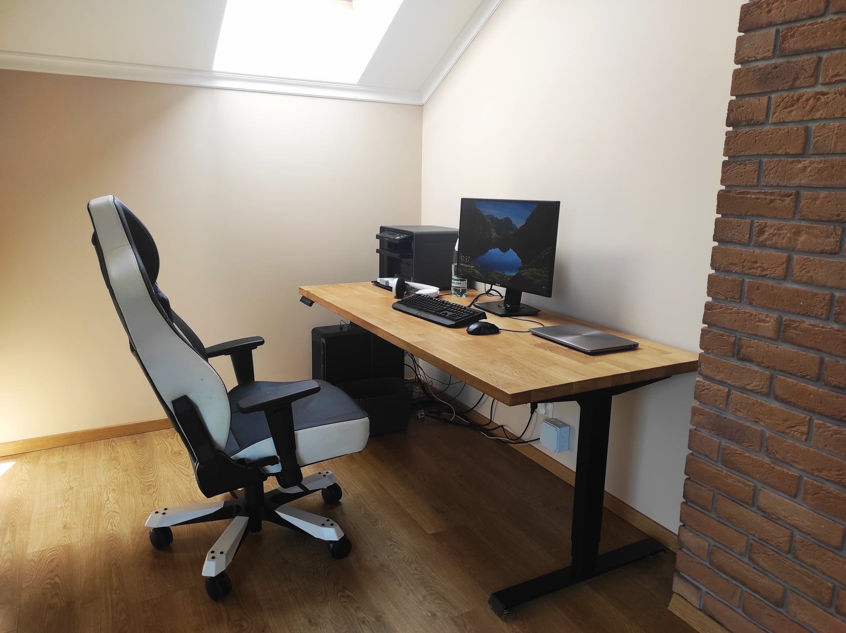Ідеально вписався в інтер‘єр. Масивні стійки, могутня дубова стільниця додають непохитності і впевненості в роботі. Замовив додатково T-виріз і органайзер для кабелів – дозволяють сховати весь «дротовий безлад». Стільницю взяв ширшу (800-ку), люблю коли на столі багато місця. Дуже переймався за якість поверхні (хотілось максимально відчувати дерево), та зараз можу з впевненістю сказати, що задоволений на всі 100%. Для тих, в кого багато статичної роботи – ідеальний варіант.