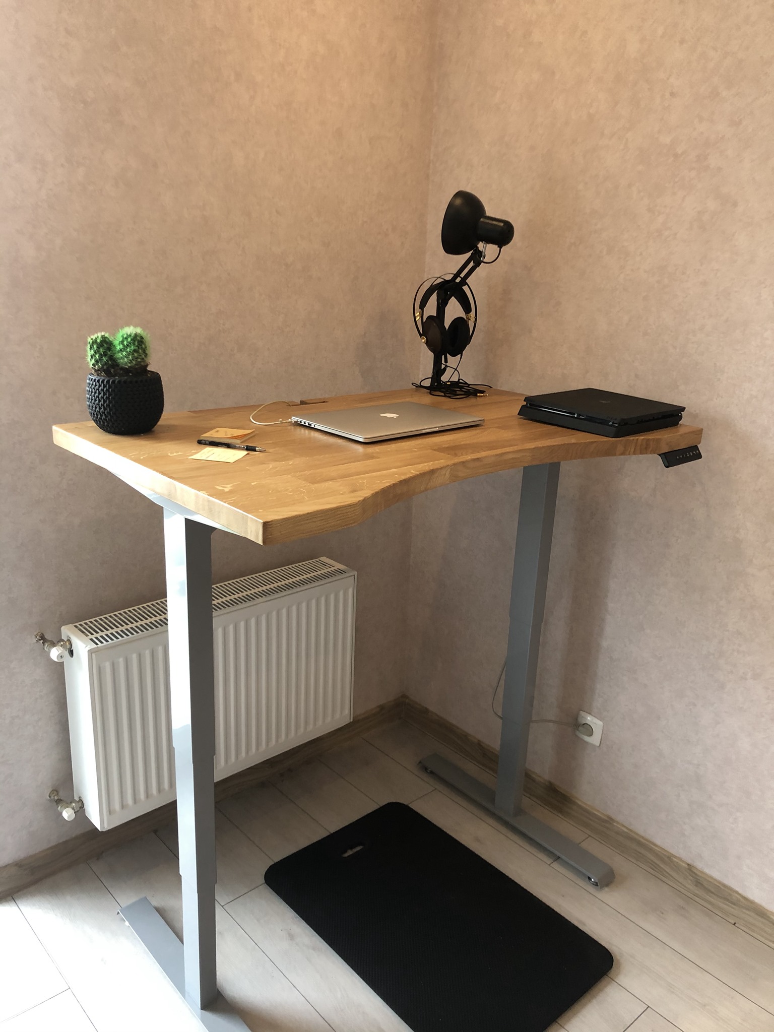 Придбав стіл, оскільки останнім часом багато чув про користь роботи стоячи і хотілося перевірити, чи дійсно це впливає на самопочуття та продуктивність. Перші дні були незвичні: працювати стоячи складніше, ніж здається. В ногах швидко відчувається напруга. На даний момент в основному продовжую роботу сидячи. Для роботи стоячи потрібно більше витривалості. Сам стіл дуже якісний: масивний дубовий масив, зручний, стійкий, нічого не хитається. Серед мінусів: 1) одна з дощечок масиву має білі вкраплення. Вдень нічого непомітно. При освітлені лампою вигладає як пляма. 2) Металева основа має доволі гостре ребро і легко пошкодити ногу 3) Коти навчилися натискати на перемикач висоти стола, коли блокування на пульті відсутнє. @stiystil