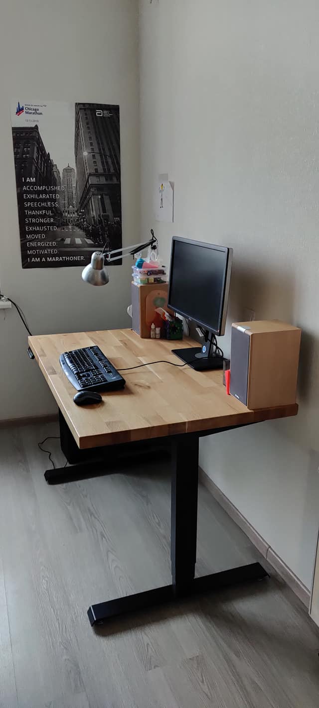Нещодавно придбали собі стіл з електро-регулюванням для роботи стоячи. Це вже другий стіл від StiyStil, – Solid маю на роботі, працюю стоячи, тому і виникла потреба придбати щось схоже додому. Довго думати не довелося, одразу знали собі, що хочемо стіл з електро-регулюванням, а чорна основа + масив дуба якнайкраще вписується в наш інтер’єр. Стіл брали без стільниці, і, оскільки її досі чекаємо, бо ж настав період “давайте вже після свят”, попрацювати за цим столом ще не вдалося. Проте, вже склали, покатали один одного вверх-вниз, перевірили на міцність і чи дійсно піднімає 100 кг. Так, піднімає 😉 Якістю задоволені, все доволі акуратно і надійно. Оскільки в домашньому кабінеті планується два робочих місця, маємо на меті згодом придбати ще один. Доставили на наступний день після замовлення. Гарантія 5 років, та, маю надію, вона нам не знадобиться. Рекомендую всім працювати стоячи! Можна рухатися, поки працюєш, пританцьовувати під музику та частіше розправляти плечі. А як набридло стояти, завжди можна опустити стіл до звичної висоти і сісти. Фото мого стій-стола з офісу.