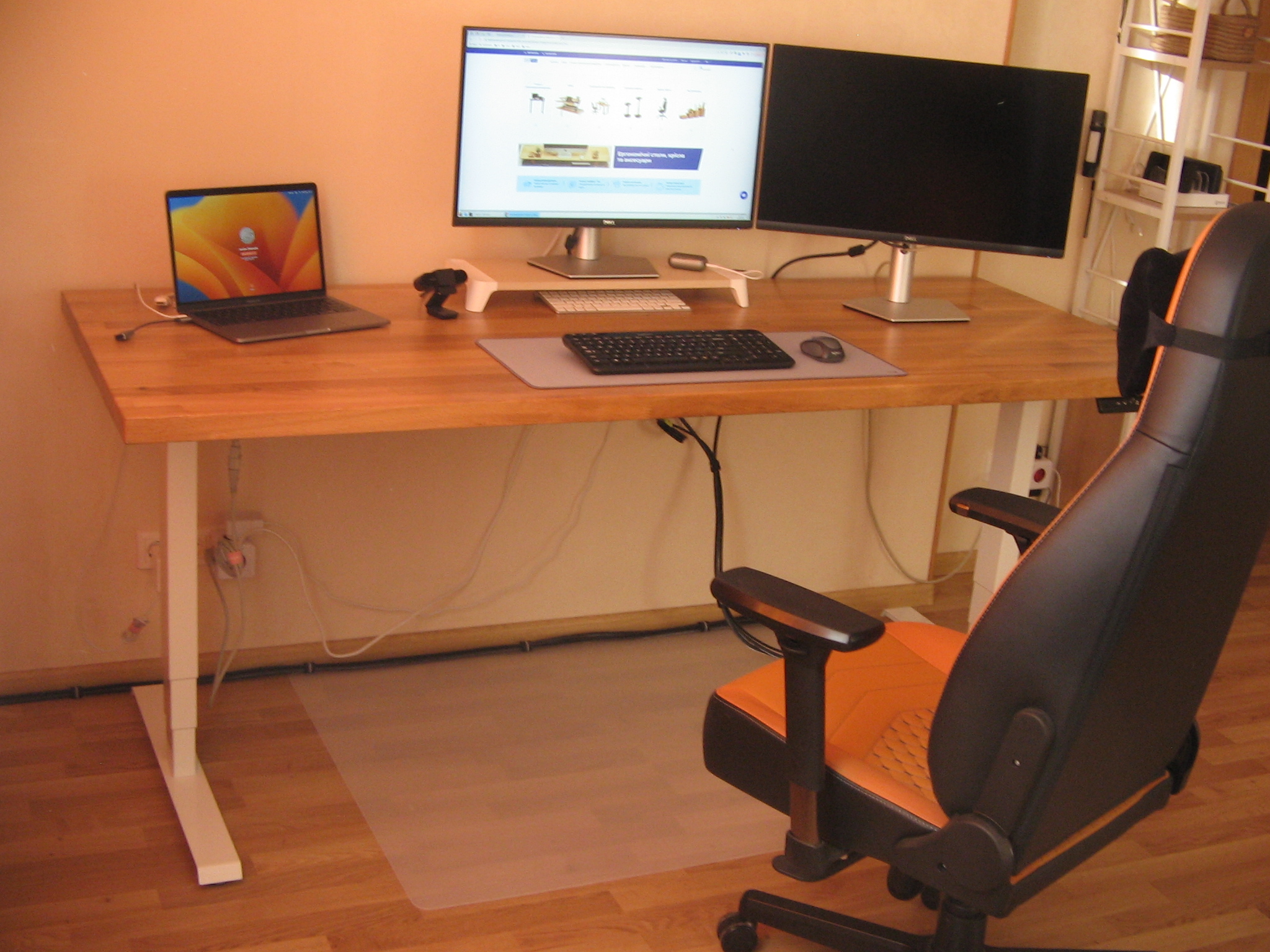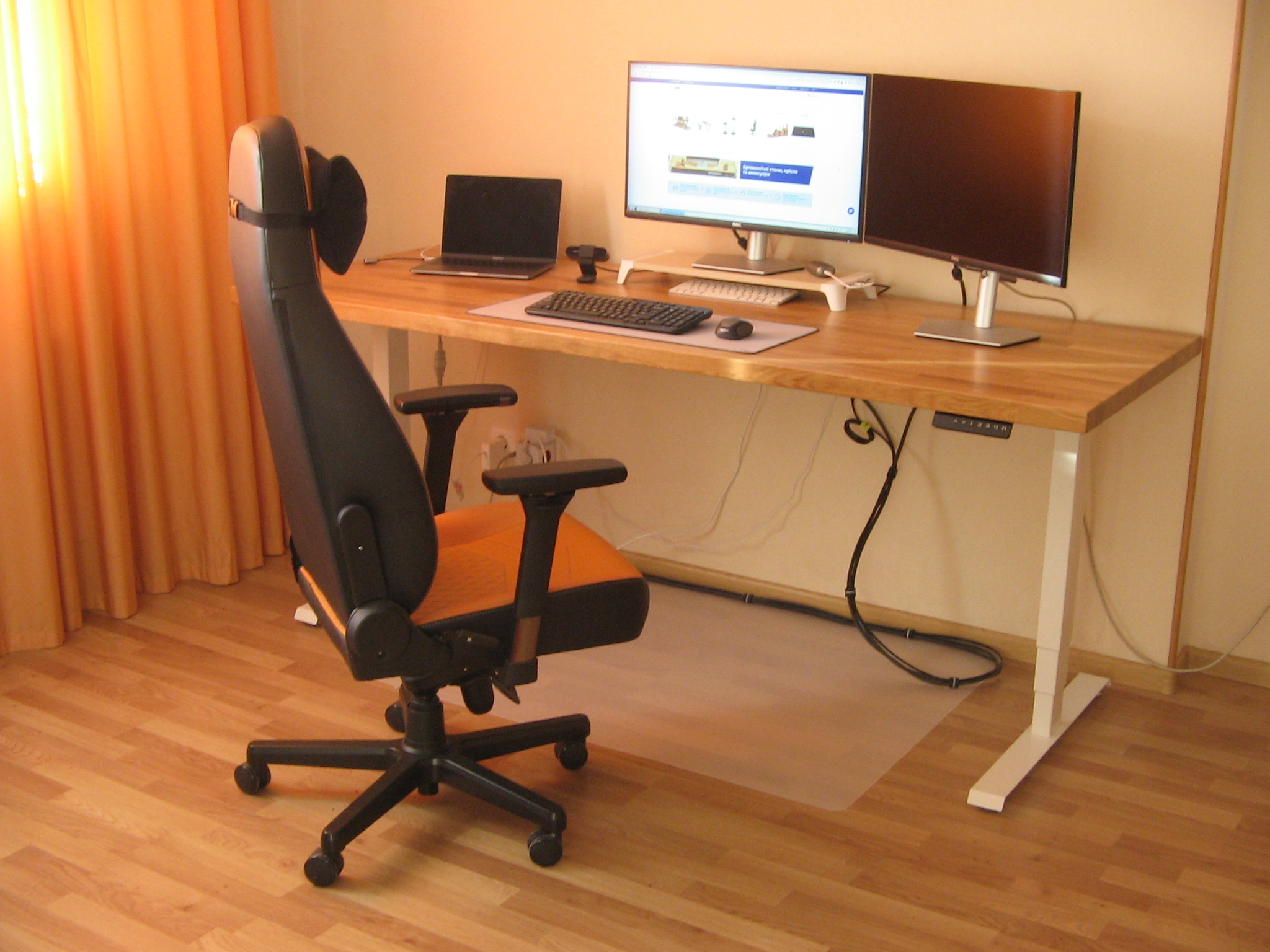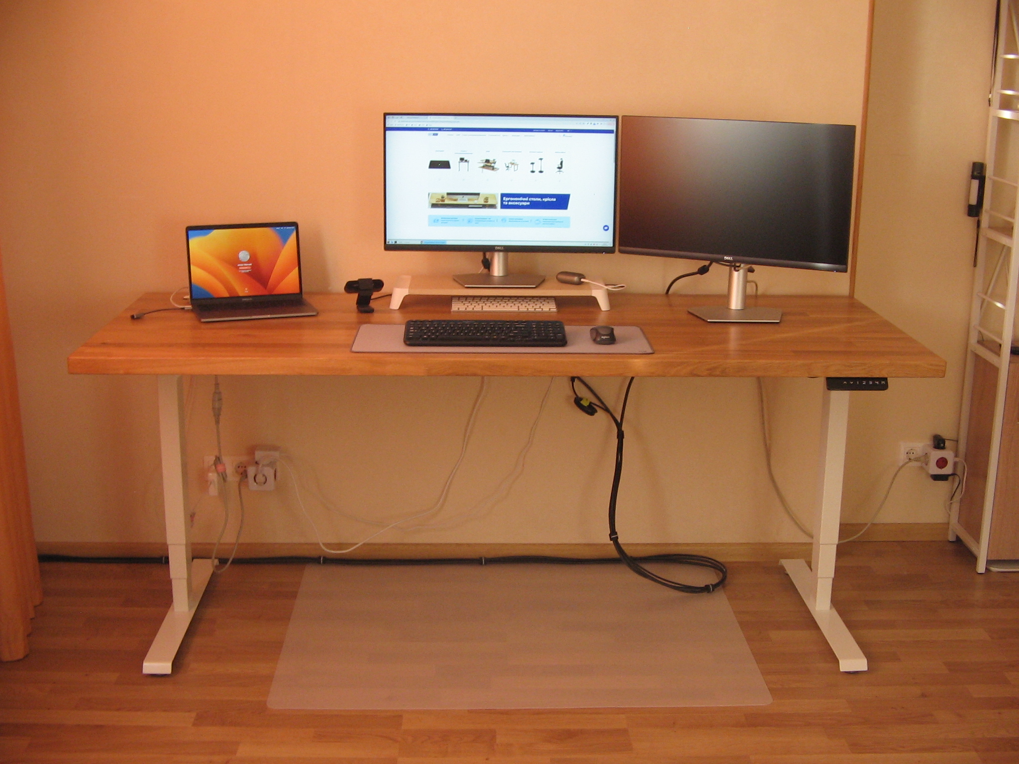 Первую неделю работал без подставки. Работать за этим столом – настоящее эстетическое удовольствие. Хоть это и не цельный дубовый массив, а сборка из разных частей, выглядит круто.