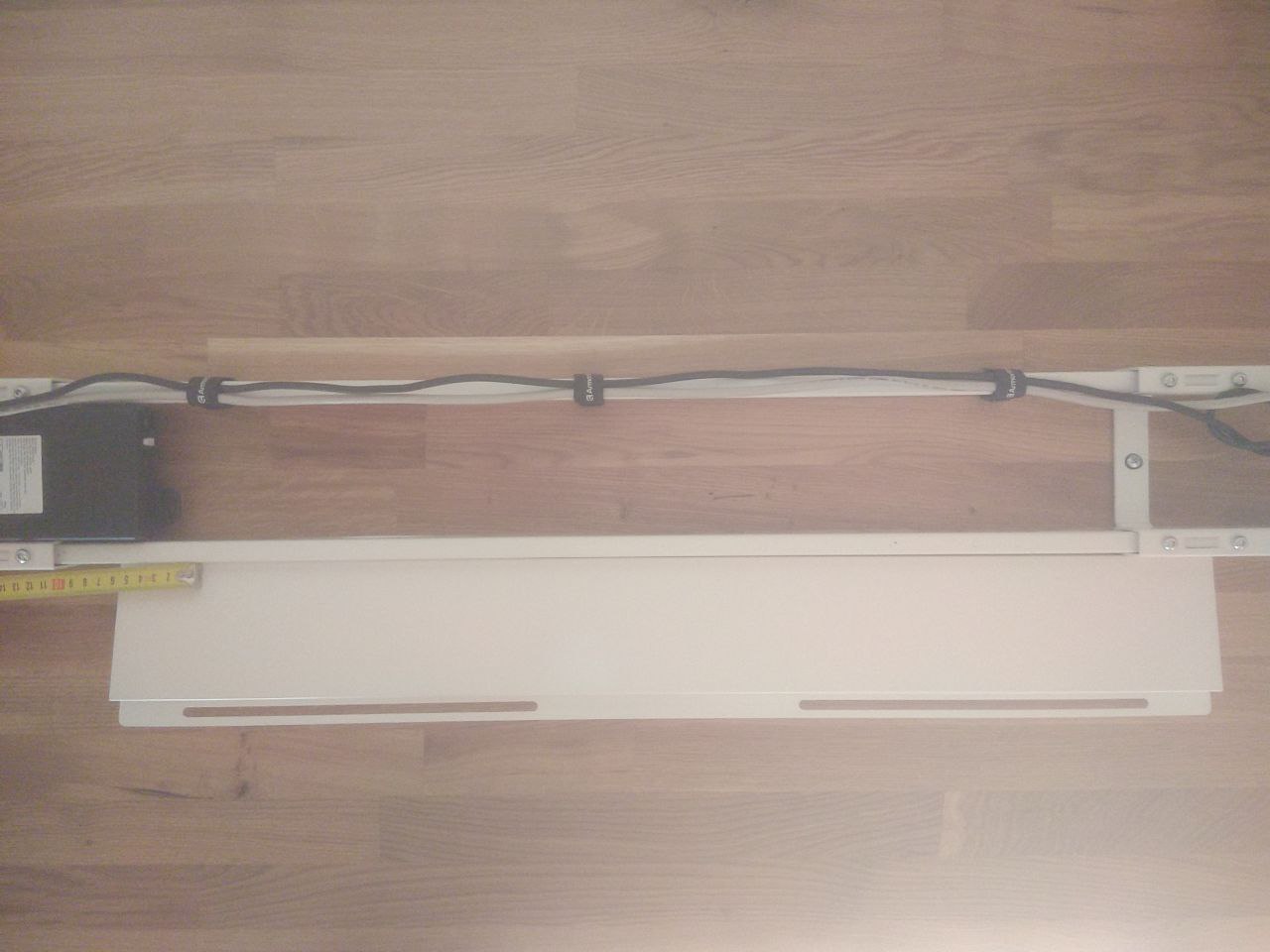 По-друге, щодо максимально можливих кастомних розмірів стільниці під цю конкретну основу, зокрема, щодо довжини більш як 2000мм. Так, телескопічний механізм між лівою та правою ніжками дозволяє роздвинути їх на достатню ширину, щоб із збереженням притомних рекомендованих відступів по бокам (місця вкручування-то вже розмічені) розмістити зверху двометрової довжини полотно, але є нюанс… Заглушка на кабель-канал натякає, що не все так однозначно, бо при такому інтервалі між ніжками її вже нема до чого прикручувати (див. останнє фото, притулив заглушку поруч разом з лінійкою для наочності, десь ~13см ліворуч просто не дотягує), а от під стільницю 1850-1870 вона все ще встала б як треба, ну тобто так, щоб хай не на всіх шурупах, але хоч по одному в кожному з прорізів заглушки трималося; це не проблема, і, зрештою, можна щось придумати, щойно руки дійдуть, та й відверто кажучи, навіть, якби про цей прикол знав, все одно брав би кастомну довжину в два метри, але як на мене, то про подібні моменти, все ж таки, непогано б знати заздалегіть, щоб хоч зайвий раз не нервувати та не перевіряти, а чи все взагалі правильно зібрано ))