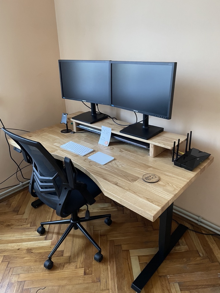 Нещодавно натрапив на підставки для моніторів від Stiystil. Є варіанти як для одного монітору, так і для двох. Спочатку дуже стримувала ціна, але всі сумніви розвіялись після того, як побачив їх вживу в шоурумі в ТЦ МАРК. Цільна деревина (дубовий масив), проміжна металева секція з повстяним покриттям і ось ця «ідеальна» для мене висота. Поличка чудово доповнила стіл, що я замовив ще минулого року. Раджу. На фото можна побачити як виглядає мій воркспейс зараз. Згодом розкажу про свій досвід з підбором стільця.