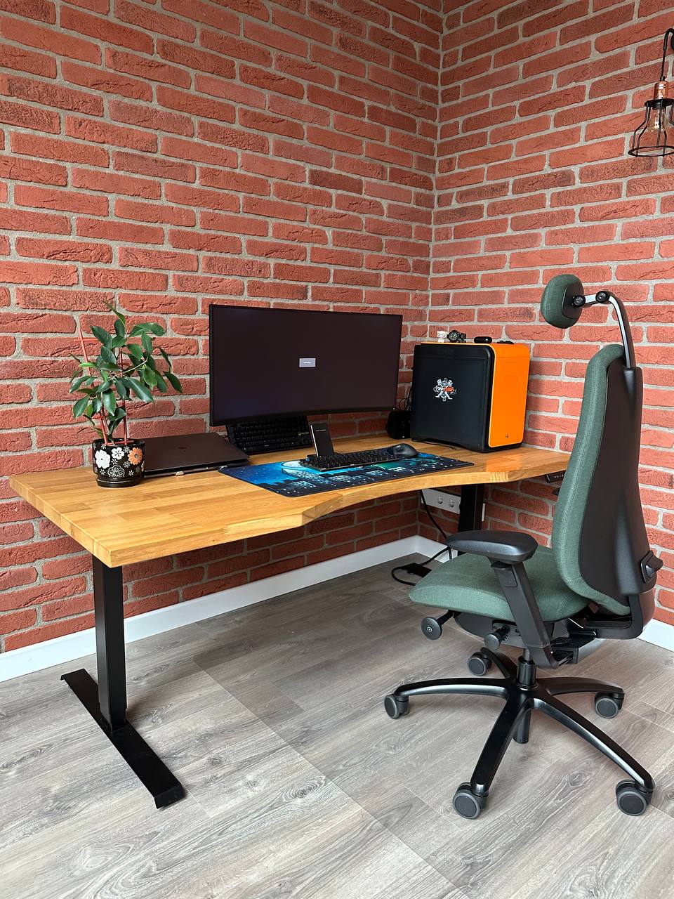 Ідеально вписався в інтер‘єр. Масивні стійки, могутня дубова стільниця додають непохитності і впевненості в роботі. Замовив додатково T-виріз і органайзер для кабелів – дозволяють сховати весь «дротовий безлад». Стільницю взяв ширшу (800-ку), люблю коли на столі багато місця. Дуже переймався за якість поверхні (хотілось максимально відчувати дерево), та зараз можу з впевненістю сказати, що задоволений на всі 100%. Для тих, в кого багато статичної роботи – ідеальний варіант.