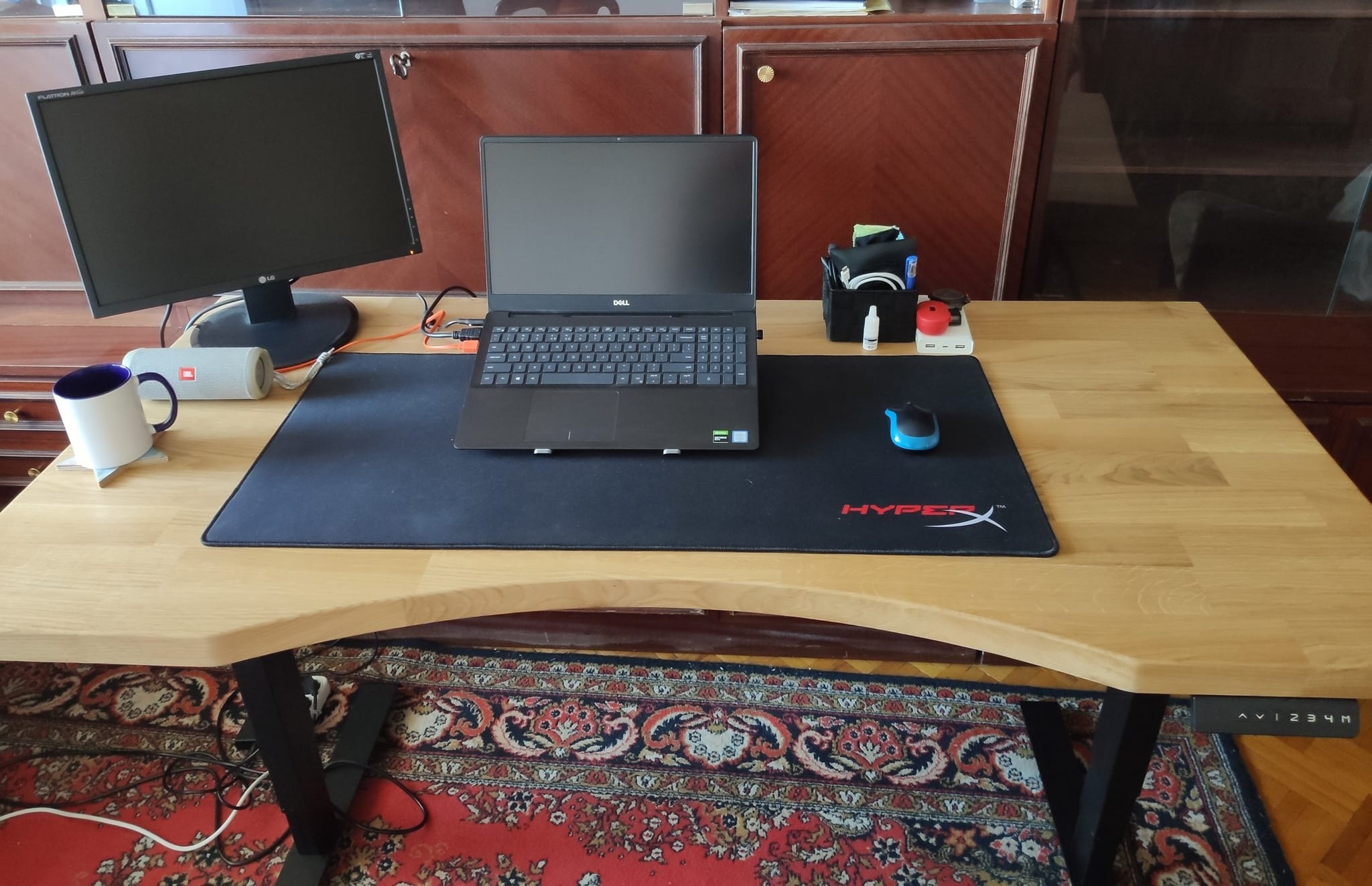 Після декількох тижнів використання можу з упевненістю сказати, що стіл повністю виправдав мої очікування. Його робоча поверхня досить простора, щоб розмістити всі необхідні для мене девайси: монітор 27 дюймів, ноутбук, акустику, а також залишити місце для дрібниць і документів. При цьому все залишається зручно доступним, без відчуття перевантаженості. Міцність і стабільність конструкції приємно здивували — навіть під час активної роботи стіл залишається нерухомим. Поверхня виглядає дуже естетично й приємна на дотик, що додає комфорту під час роботи.