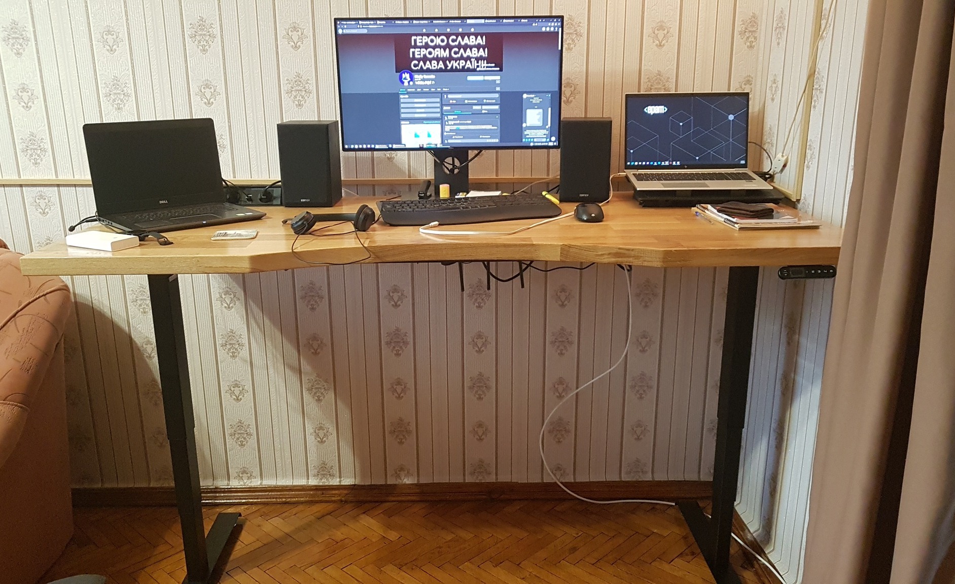 Я взяв про версію столу, яка має кнопки регулювання висоти, що спрощує зміни положення, а також на стіл можна встановити досить велику стільницю, на якій легко поміщаються два монітори і все необхідне.