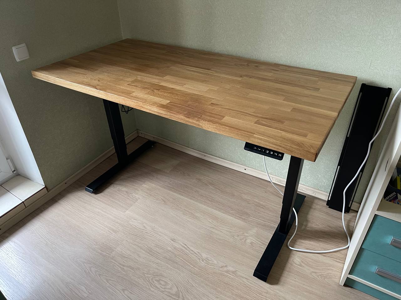 Дубова стільниця (взяли 1800 х 800) дуже приємна на дотик, масивна та візуально дуже гарна (товщина 4 см). Механізм підйому чіткий, тихий та зручний.