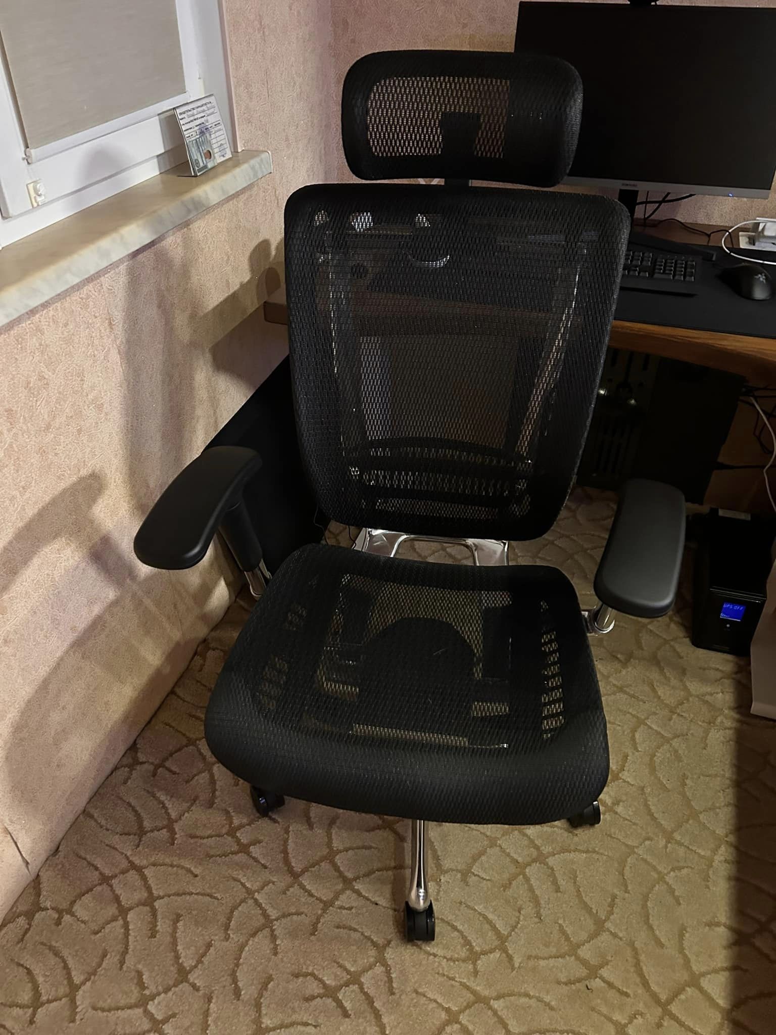 Крісло також дуже круте, спочатку було відчутття що воно дуже тверде і не сильно зручне, але це не так. З таким кріслом значно зручніше працювати ніж на м‘якому. До того ж я думаю буде дуже комфортно літом, оскільки воно в сітку та буде дихати шкіра.