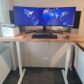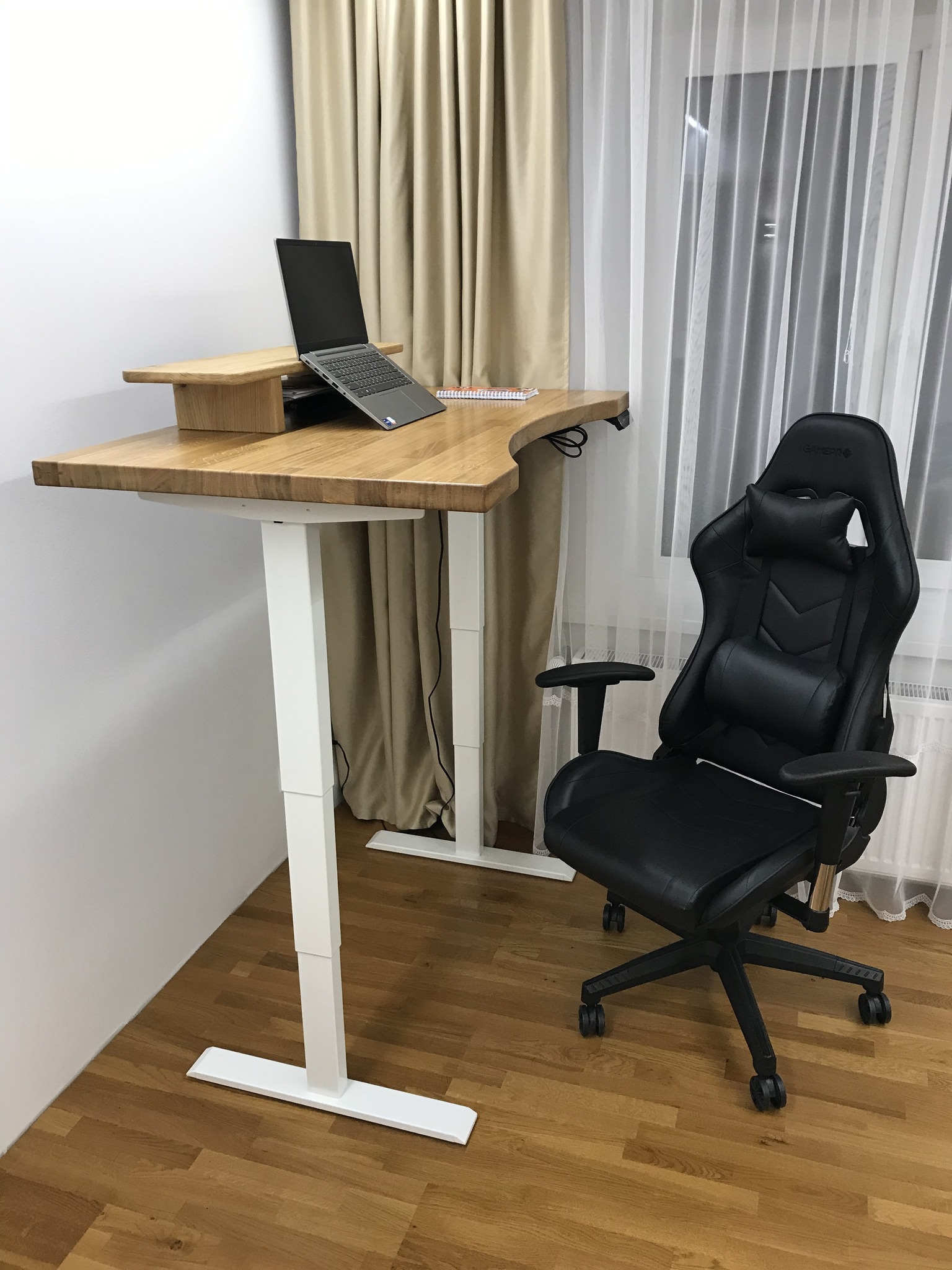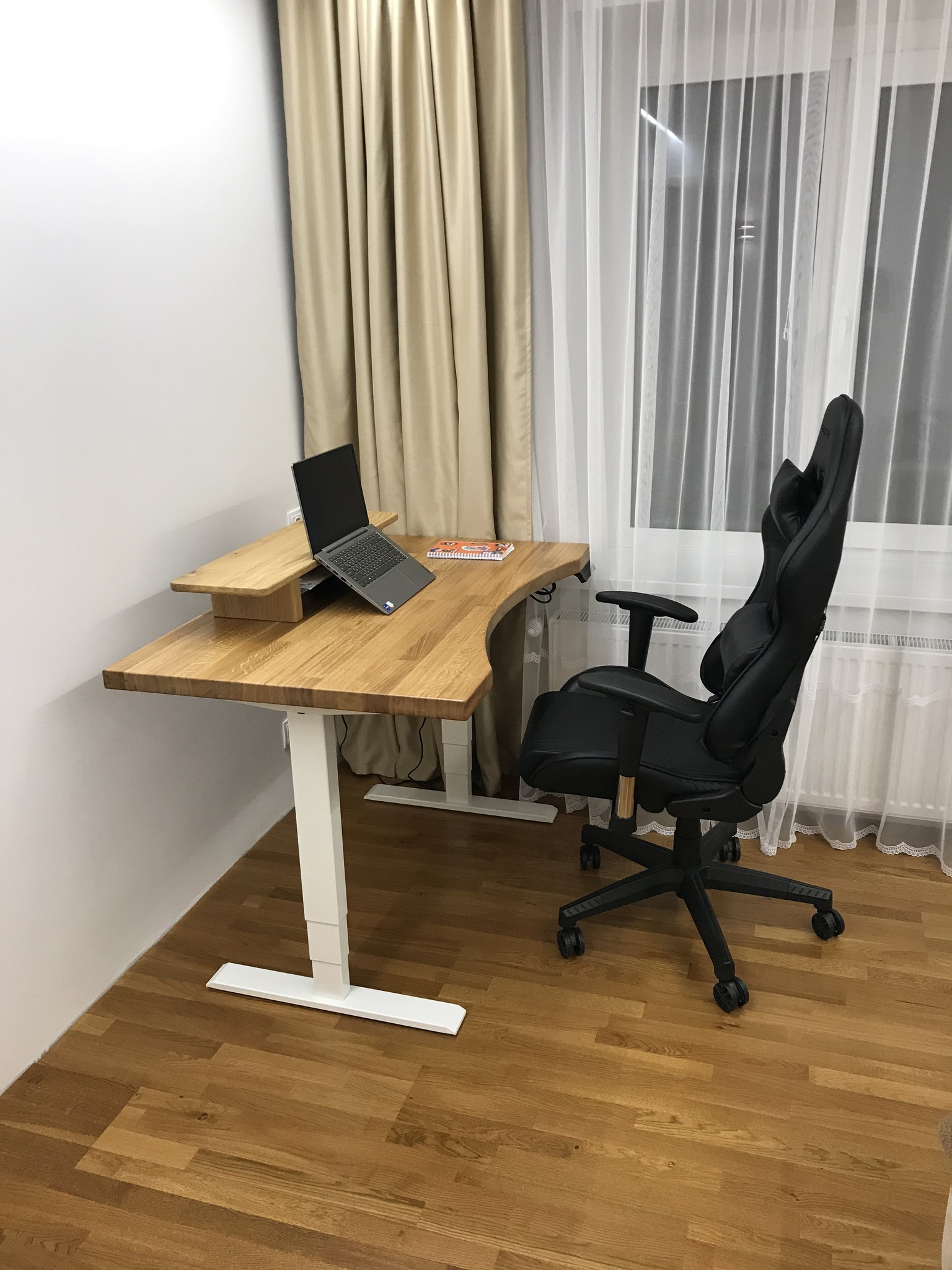 Працювати за столом приємно, стільниця з натурального дерева дуже кайфова. Є опція додати виріз радіус та під кабелі, все продумано. Ніжки стола стійкі, стіл не хитається як в звичайному, так і найвищому положенні. Є пульт управління, кнопки підйому та функція запам’ятовування висоти.