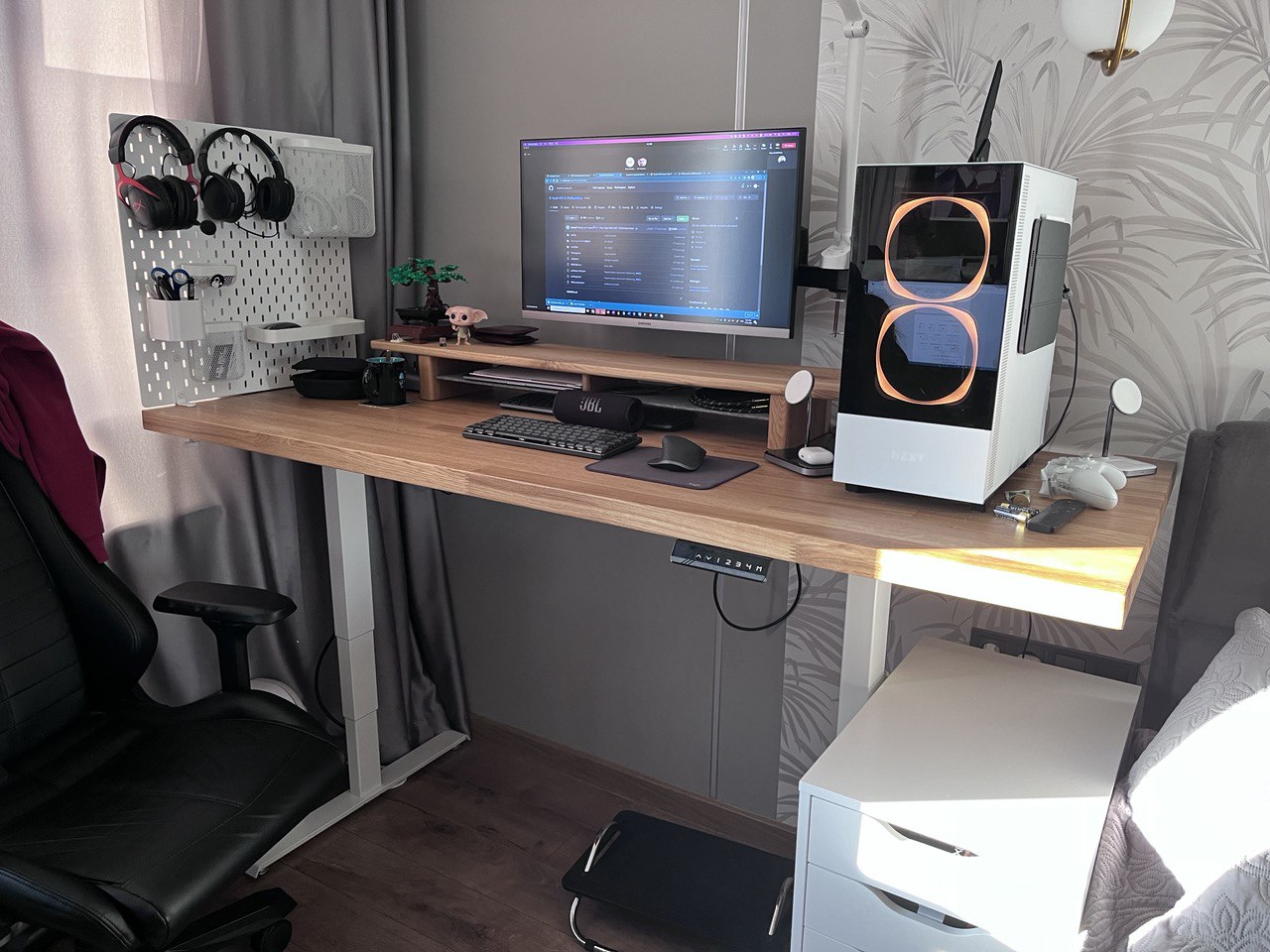 Нещодавно натрапив на підставки для моніторів від Stiystil. Є варіанти як для одного монітору, так і для двох. Спочатку дуже стримувала ціна, але всі сумніви розвіялись після того, як побачив їх вживу в шоурумі в ТЦ МАРК. Цільна деревина (дубовий масив), проміжна металева секція з повстяним покриттям і ось ця «ідеальна» для мене висота. Поличка чудово доповнила стіл, що я замовив ще минулого року. Раджу. На фото можна побачити як виглядає мій воркспейс зараз. Згодом розкажу про свій досвід з підбором стільця.