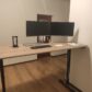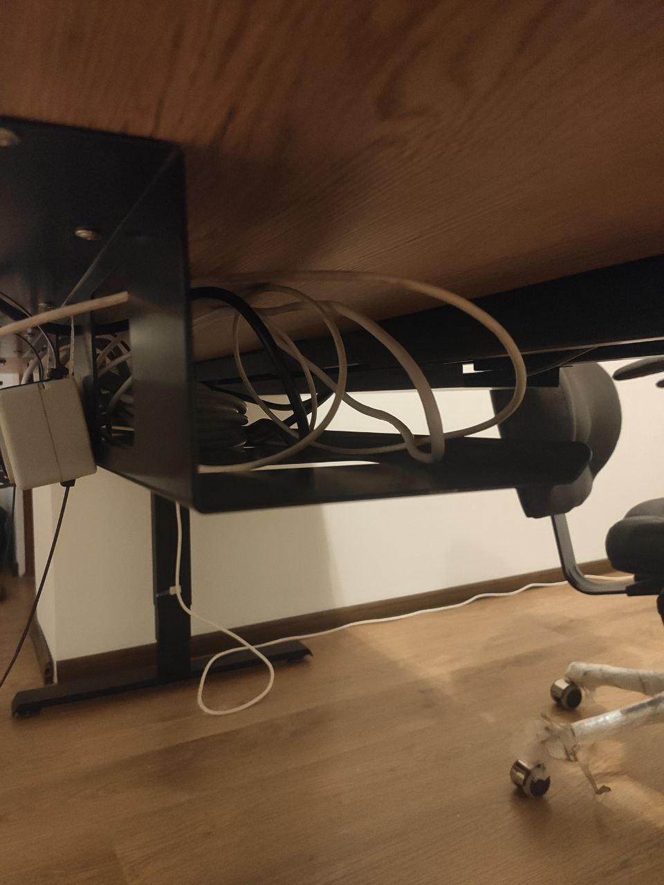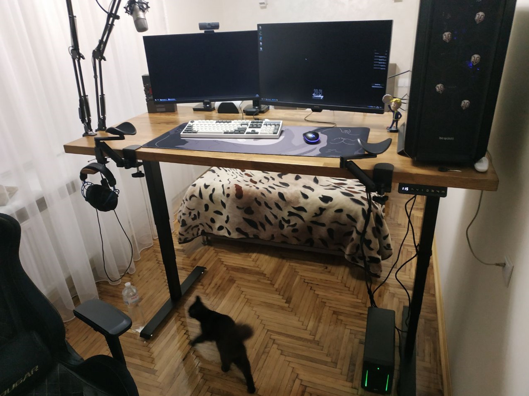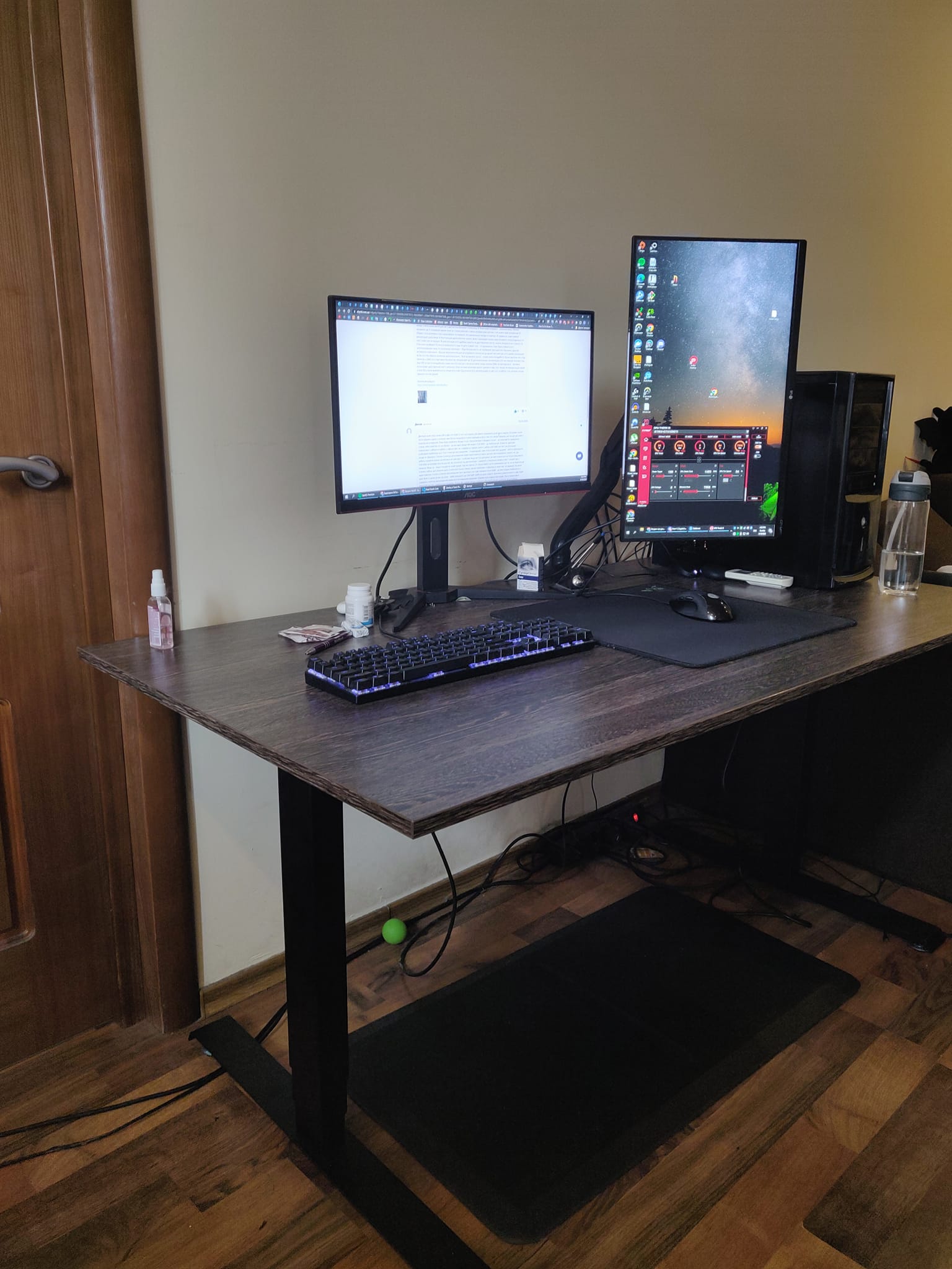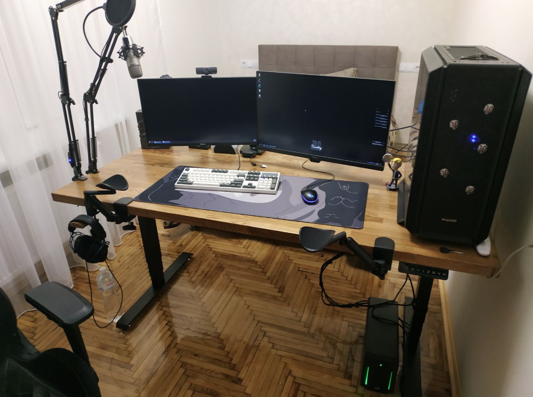Мені здавалось що через те що в столі є рухомі частини він буде не дуже стійким. Я боявся що монітори на стандартних підставках будуть хитатися, але в реальності стіл стійкий, підйом достатньо плавний, тож жодних проблем. (Я все одно поставив монітори на кронштейни, але це з інших причин.)
