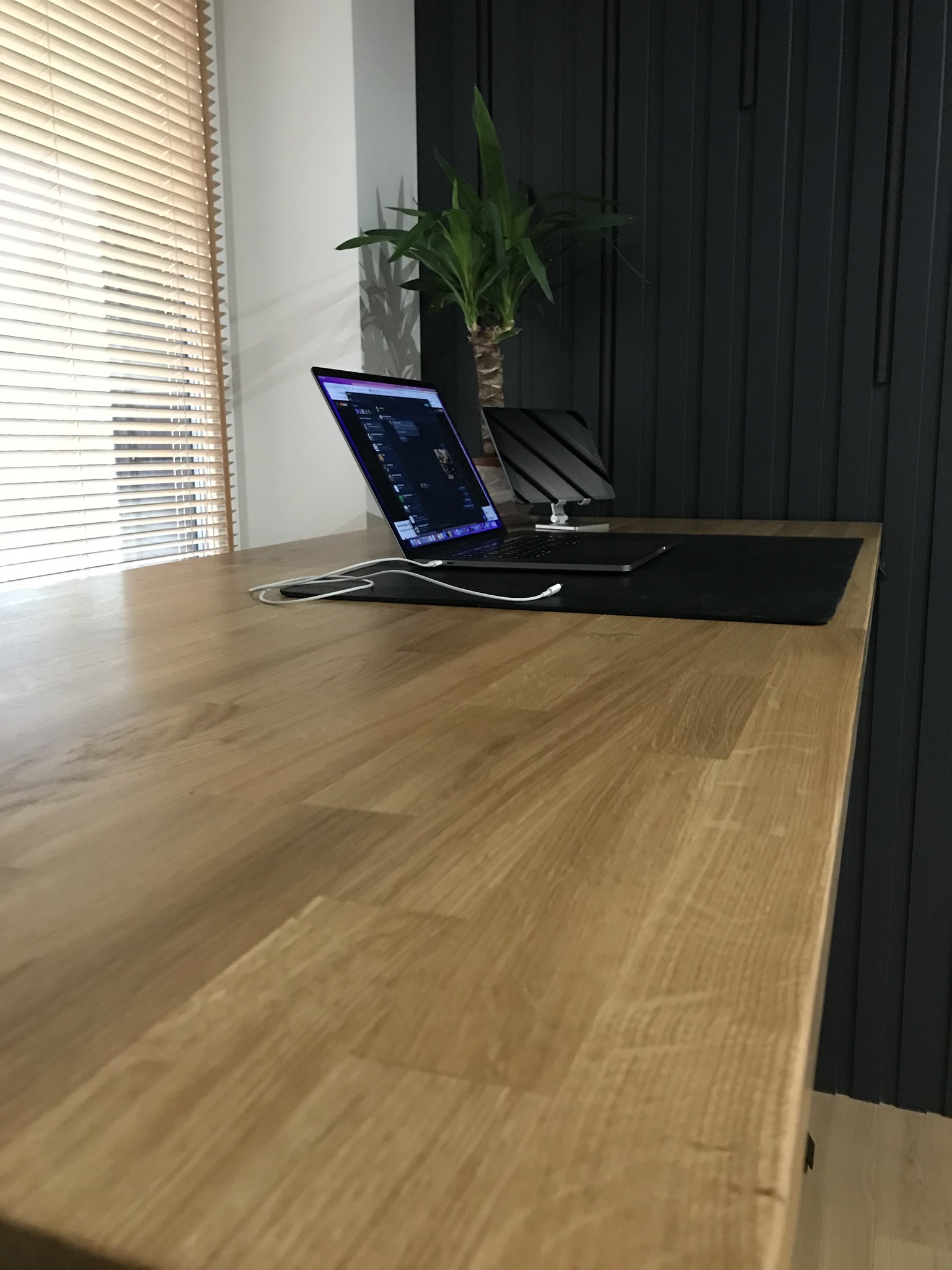Первую неделю работал без подставки. Работать за этим столом – настоящее эстетическое удовольствие. Хоть это и не цельный дубовый массив, а сборка из разных частей, выглядит круто.