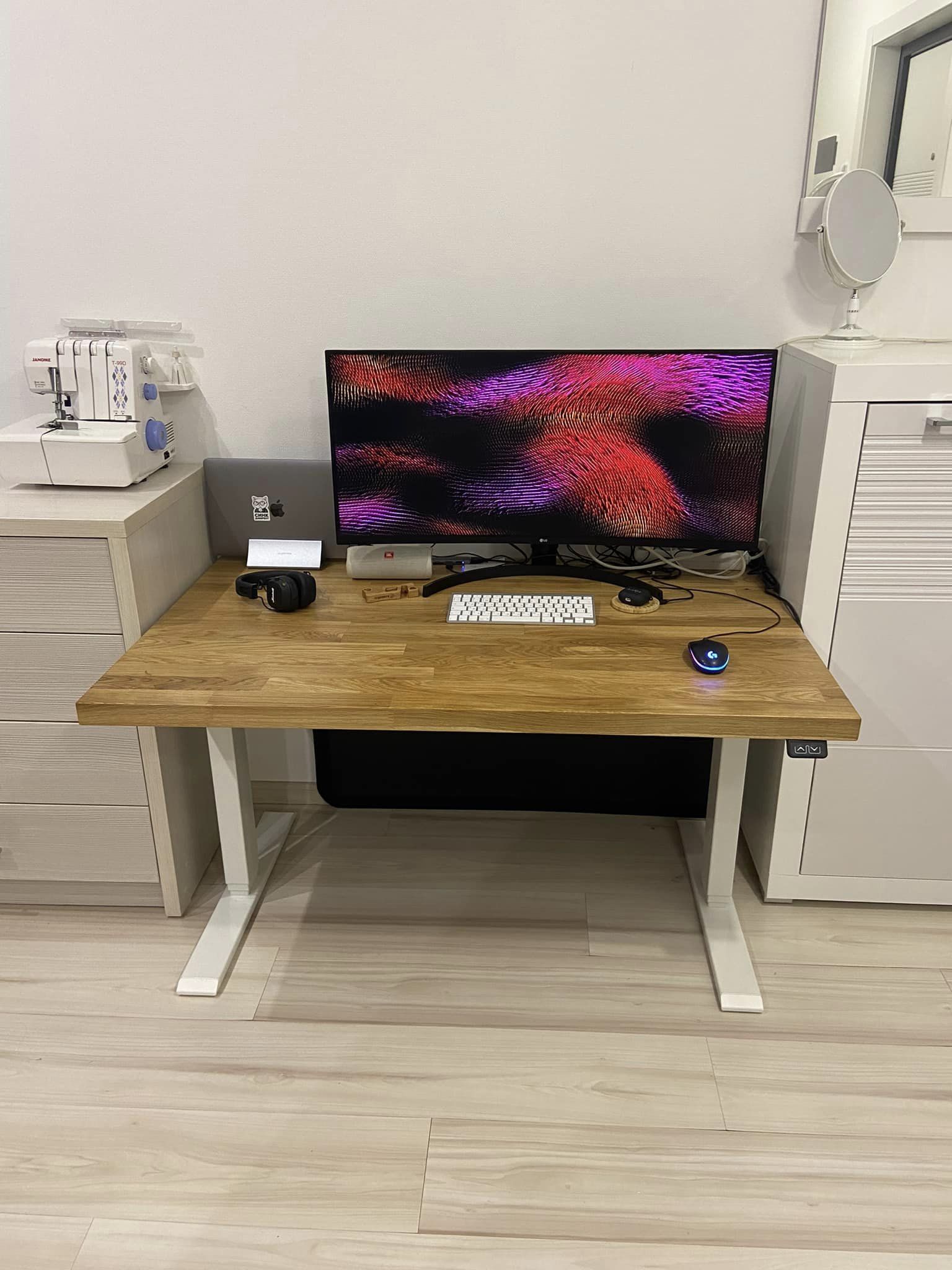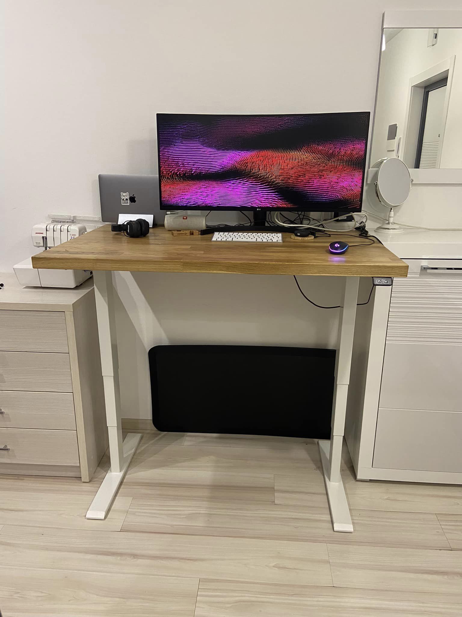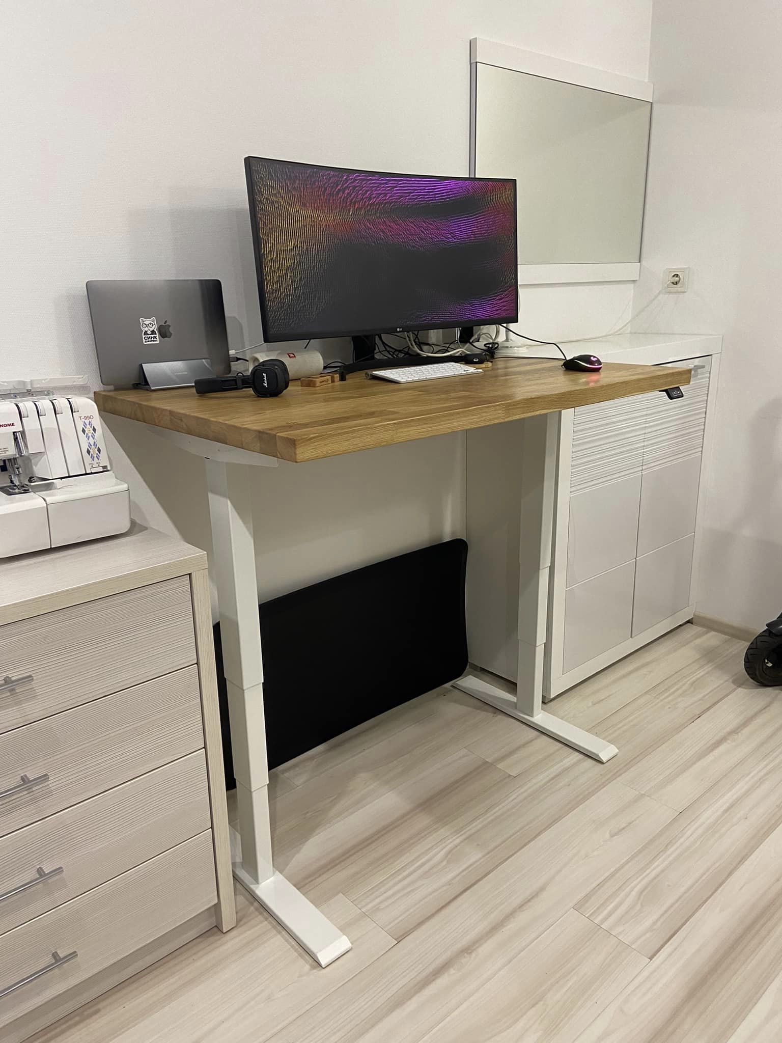 Придбав стіл, оскільки останнім часом багато чув про користь роботи стоячи і хотілося перевірити, чи дійсно це впливає на самопочуття та продуктивність. Перші дні були незвичні: працювати стоячи складніше, ніж здається. В ногах швидко відчувається напруга. На даний момент в основному продовжую роботу сидячи. Для роботи стоячи потрібно більше витривалості. Сам стіл дуже якісний: масивний дубовий масив, зручний, стійкий, нічого не хитається. Серед мінусів: 1) одна з дощечок масиву має білі вкраплення. Вдень нічого непомітно. При освітлені лампою вигладає як пляма. 2) Металева основа має доволі гостре ребро і легко пошкодити ногу 3) Коти навчилися натискати на перемикач висоти стола, коли блокування на пульті відсутнє. @stiystil