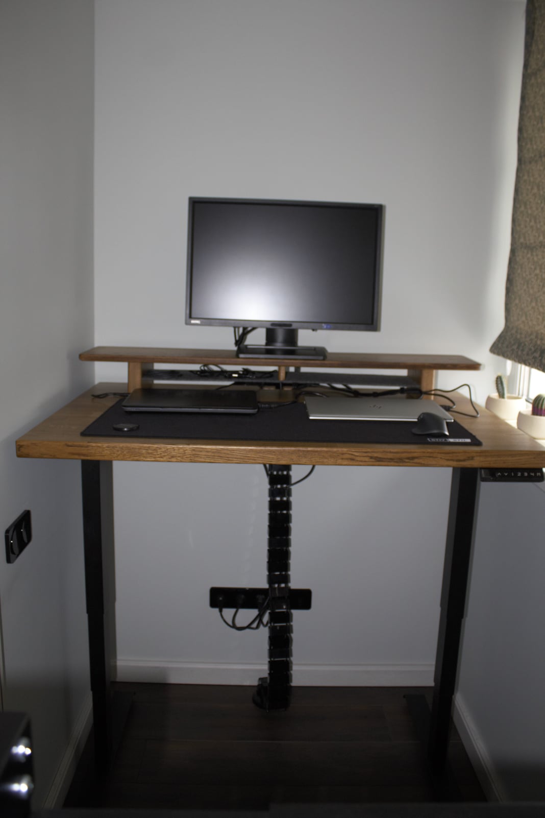 Нещодавно натрапив на підставки для моніторів від Stiystil. Є варіанти як для одного монітору, так і для двох. Спочатку дуже стримувала ціна, але всі сумніви розвіялись після того, як побачив їх вживу в шоурумі в ТЦ МАРК. Цільна деревина (дубовий масив), проміжна металева секція з повстяним покриттям і ось ця «ідеальна» для мене висота. Поличка чудово доповнила стіл, що я замовив ще минулого року. Раджу. На фото можна побачити як виглядає мій воркспейс зараз. Згодом розкажу про свій досвід з підбором стільця.