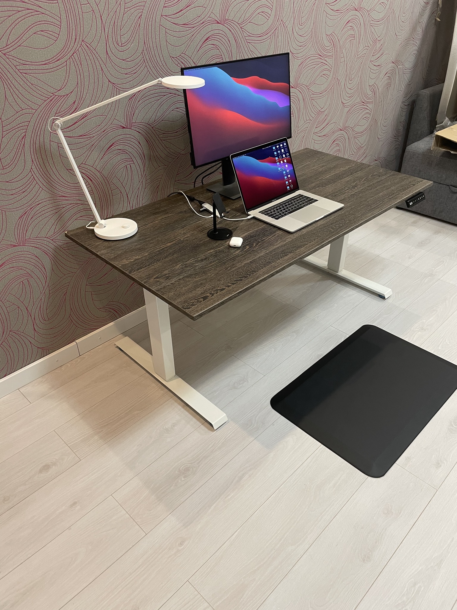 Теперь про сам опыт использования. Для начала, – это очень стильный стол, поднимается быстро и тихо, устойчивый. Легко собирается. Работать стоя комфортно. Обычно я стоя провожу звонки по работе, передвигаясь по коврику под ногами, который снимает нагрузку, и, в целом, очень приятный и мягкий для стоп. Также поднимаю стол, когда куда-то мотаюсь по дому. Либо опускаю его, когда откидываюсь в кресле, и хочется закинуть ноги 😂 Органайзер прячет весь кабель-менеджмент, и от стола свисает лишь один провод в розетку.