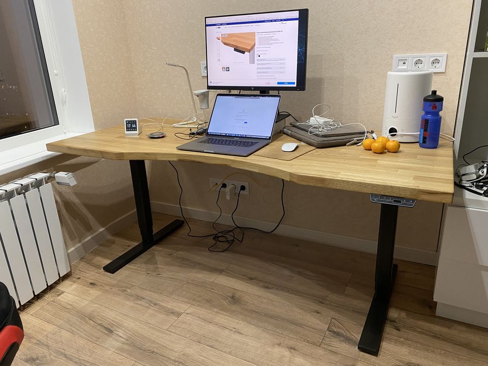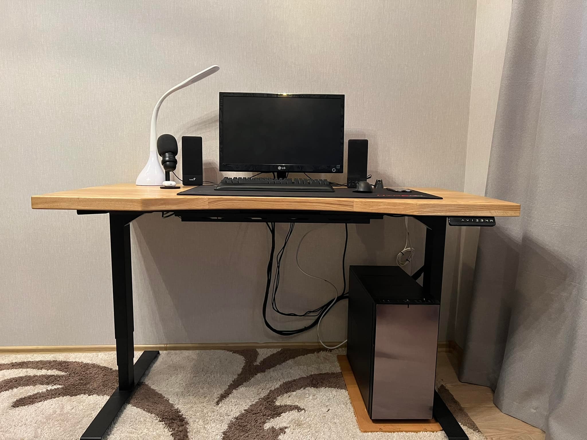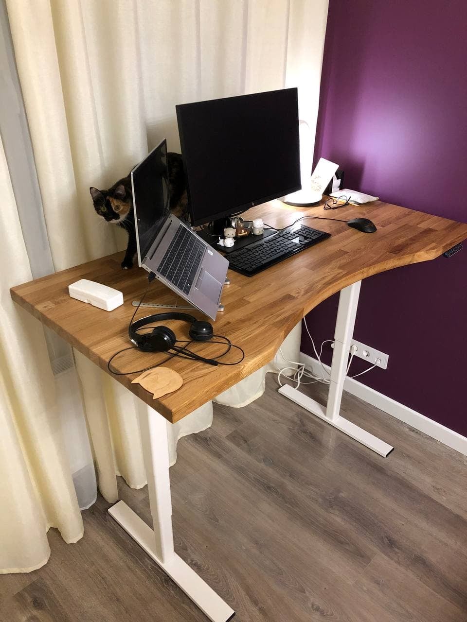 Придбав стіл, оскільки останнім часом багато чув про користь роботи стоячи і хотілося перевірити, чи дійсно це впливає на самопочуття та продуктивність. Перші дні були незвичні: працювати стоячи складніше, ніж здається. В ногах швидко відчувається напруга. На даний момент в основному продовжую роботу сидячи. Для роботи стоячи потрібно більше витривалості. Сам стіл дуже якісний: масивний дубовий масив, зручний, стійкий, нічого не хитається. Серед мінусів: 1) одна з дощечок масиву має білі вкраплення. Вдень нічого непомітно. При освітлені лампою вигладає як пляма. 2) Металева основа має доволі гостре ребро і легко пошкодити ногу 3) Коти навчилися натискати на перемикач висоти стола, коли блокування на пульті відсутнє. @stiystil