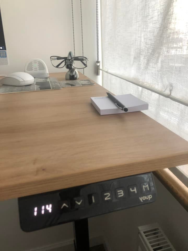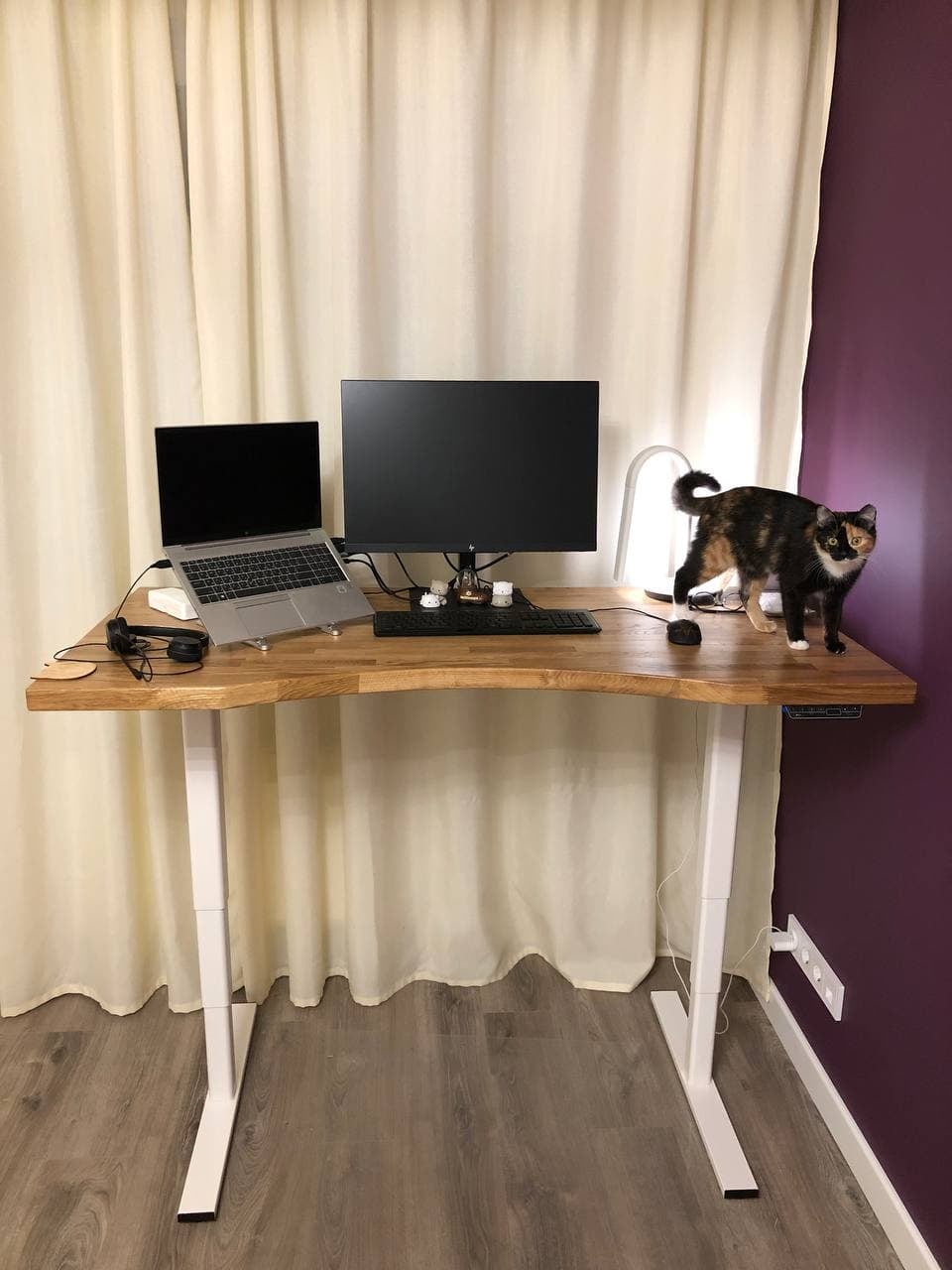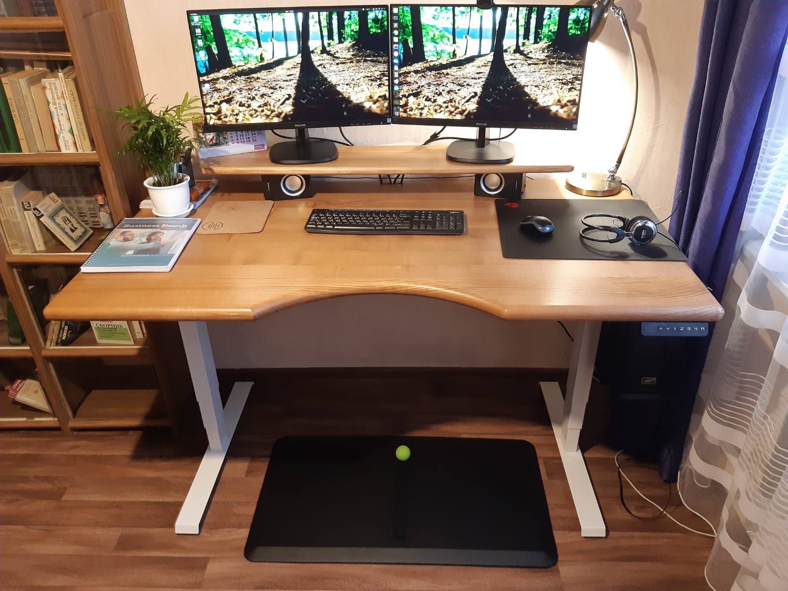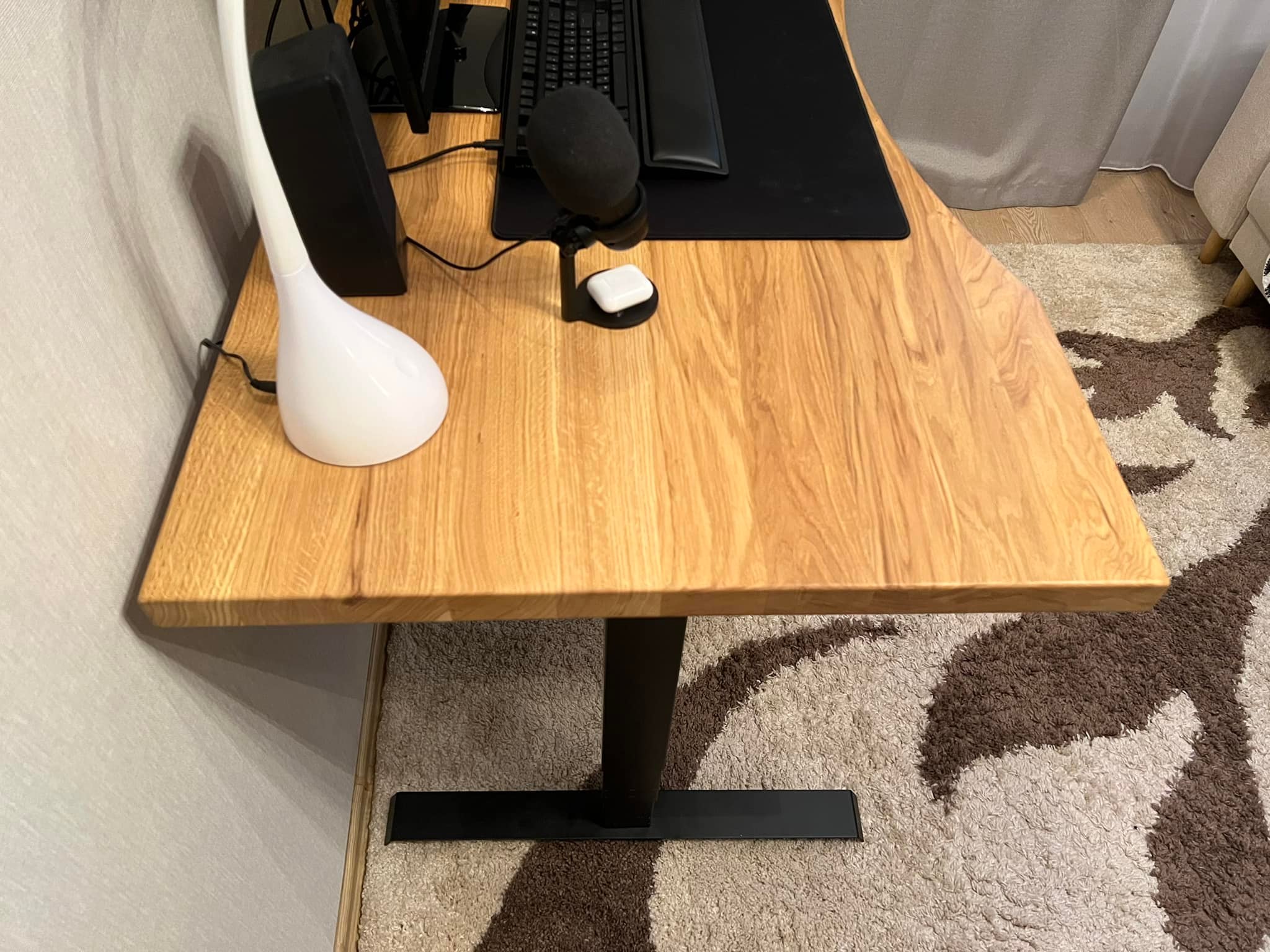Придбав стіл, оскільки останнім часом багато чув про користь роботи стоячи і хотілося перевірити, чи дійсно це впливає на самопочуття та продуктивність. Перші дні були незвичні: працювати стоячи складніше, ніж здається. В ногах швидко відчувається напруга. На даний момент в основному продовжую роботу сидячи. Для роботи стоячи потрібно більше витривалості. Сам стіл дуже якісний: масивний дубовий масив, зручний, стійкий, нічого не хитається. Серед мінусів: 1) одна з дощечок масиву має білі вкраплення. Вдень нічого непомітно. При освітлені лампою вигладає як пляма. 2) Металева основа має доволі гостре ребро і легко пошкодити ногу 3) Коти навчилися натискати на перемикач висоти стола, коли блокування на пульті відсутнє. @stiystil