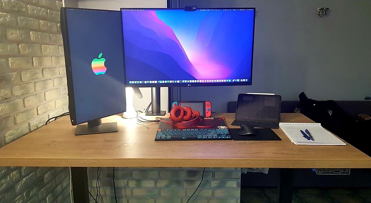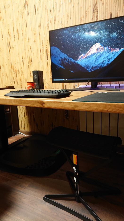 Нещодавно натрапив на підставки для моніторів від Stiystil. Є варіанти як для одного монітору, так і для двох. Спочатку дуже стримувала ціна, але всі сумніви розвіялись після того, як побачив їх вживу в шоурумі в ТЦ МАРК. Цільна деревина (дубовий масив), проміжна металева секція з повстяним покриттям і ось ця «ідеальна» для мене висота. Поличка чудово доповнила стіл, що я замовив ще минулого року. Раджу. На фото можна побачити як виглядає мій воркспейс зараз. Згодом розкажу про свій досвід з підбором стільця.