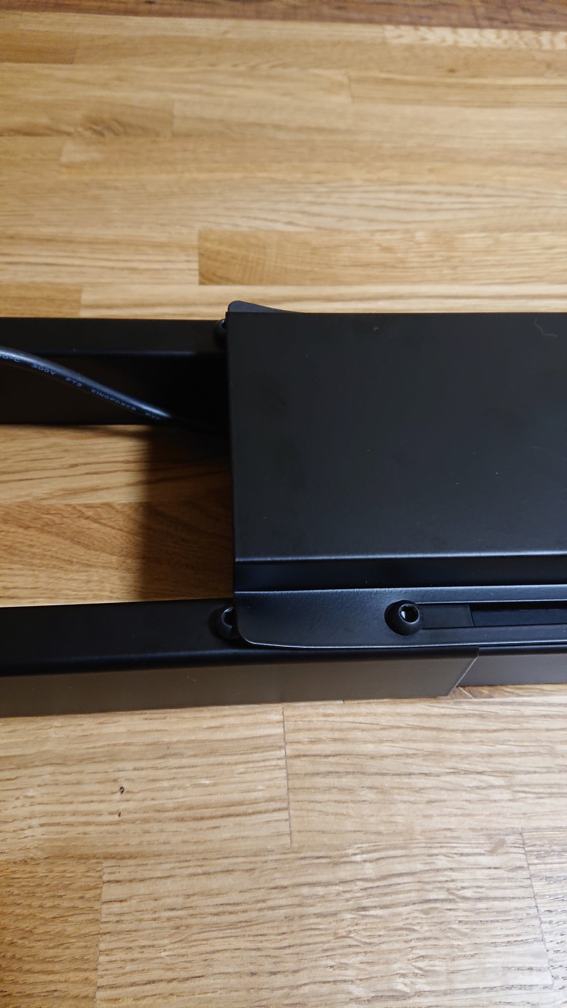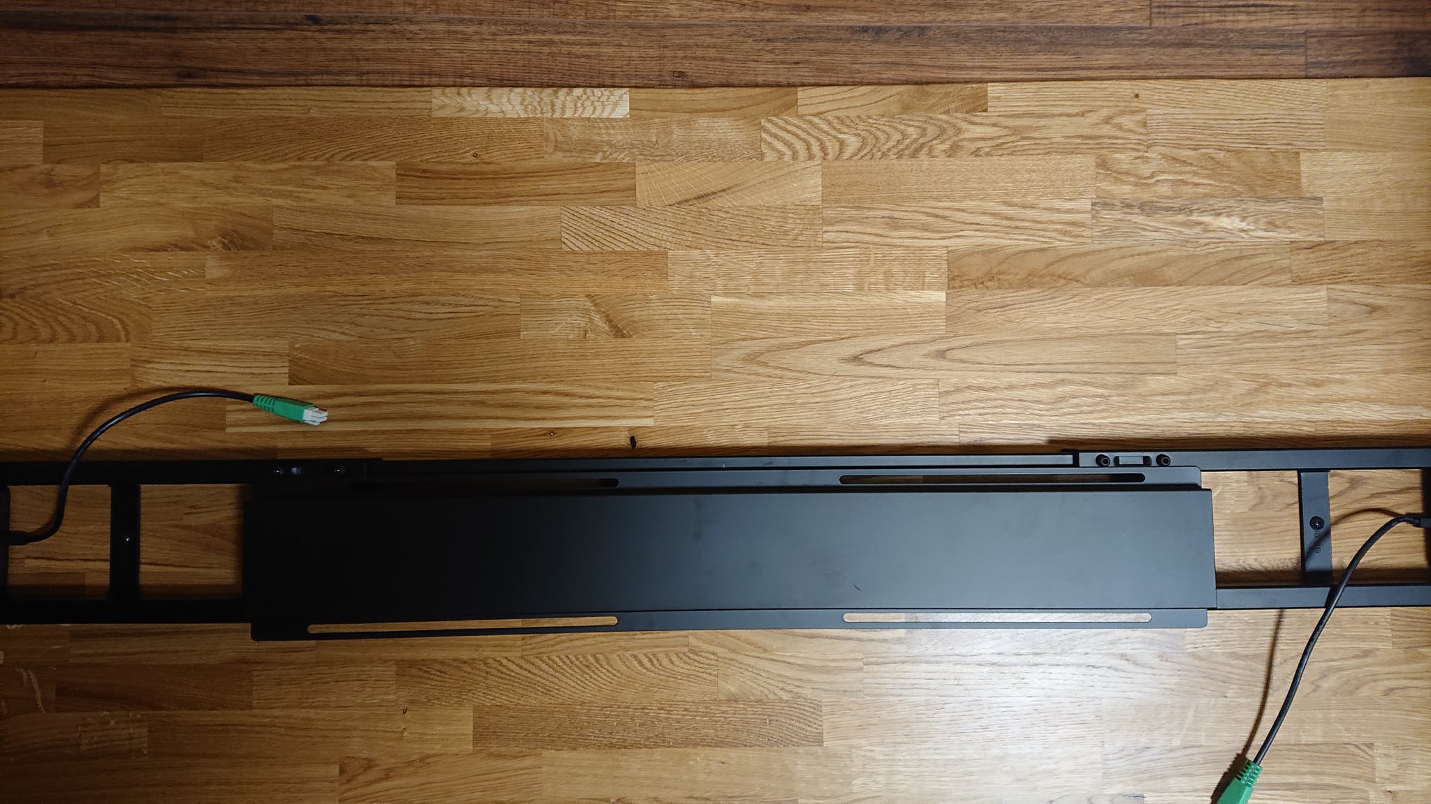 Во время сборки возникли сложности. В столешнице производителем были подготовлены отверстия для крепления рамы. Я собрал по этим отверстиям. Металлическая крышка, которая прикрывает провода, оказалась короткая и пришлось её прикрутить как на фото, погнув её.