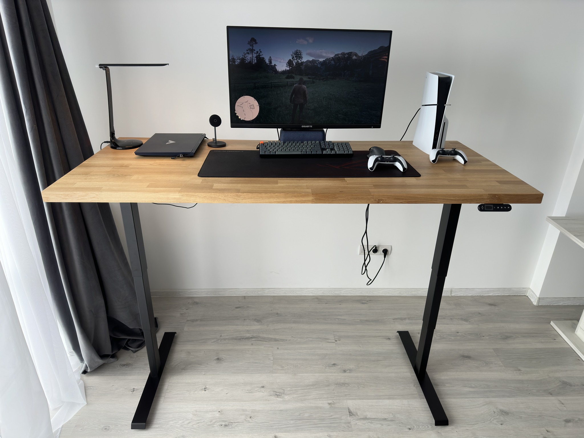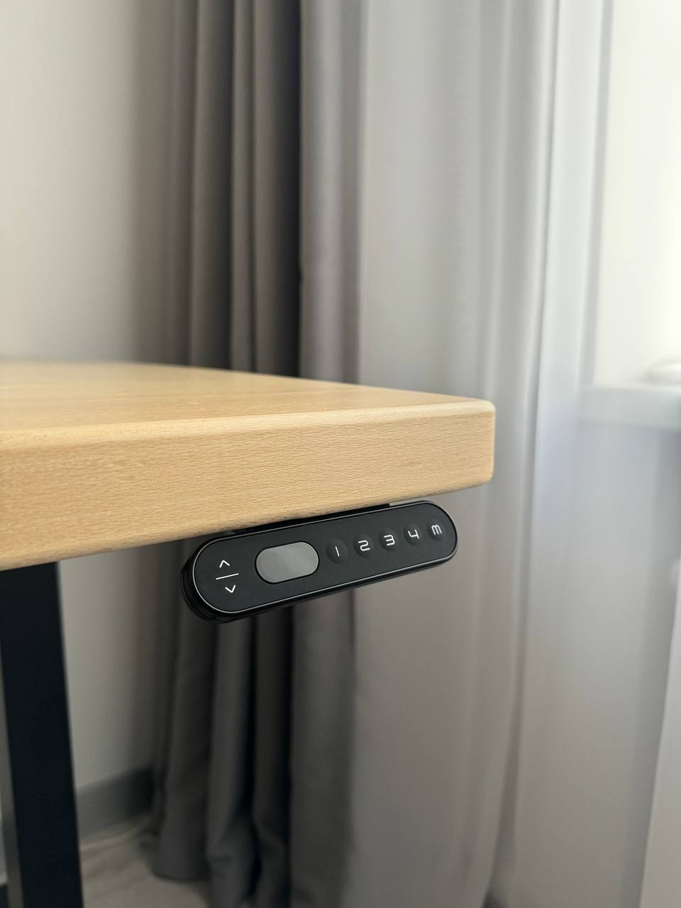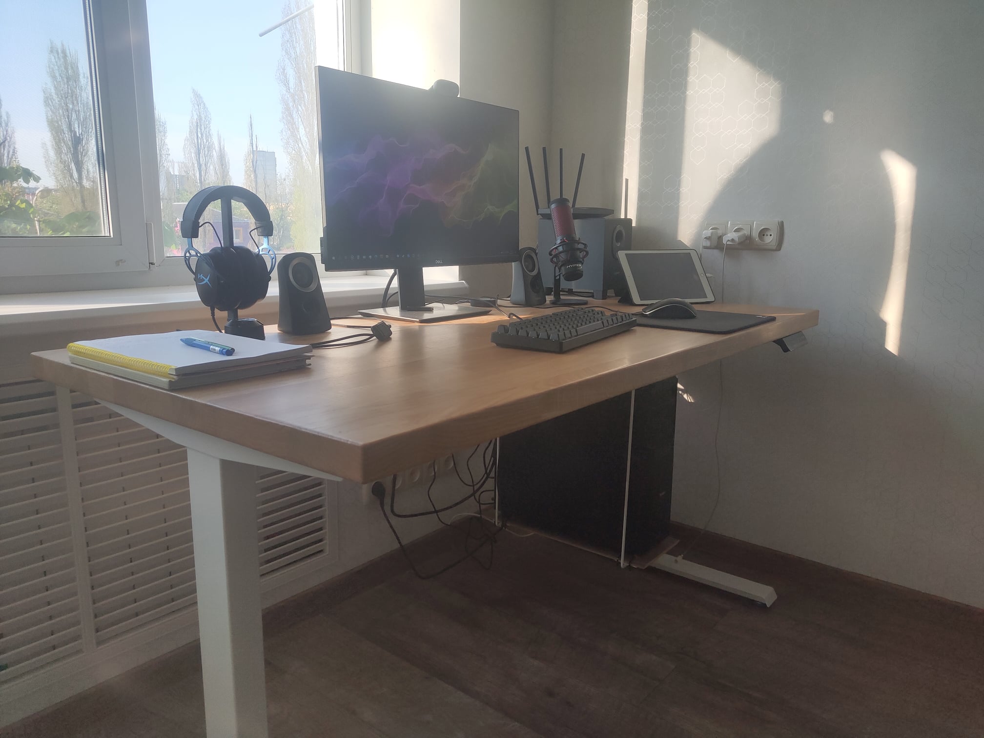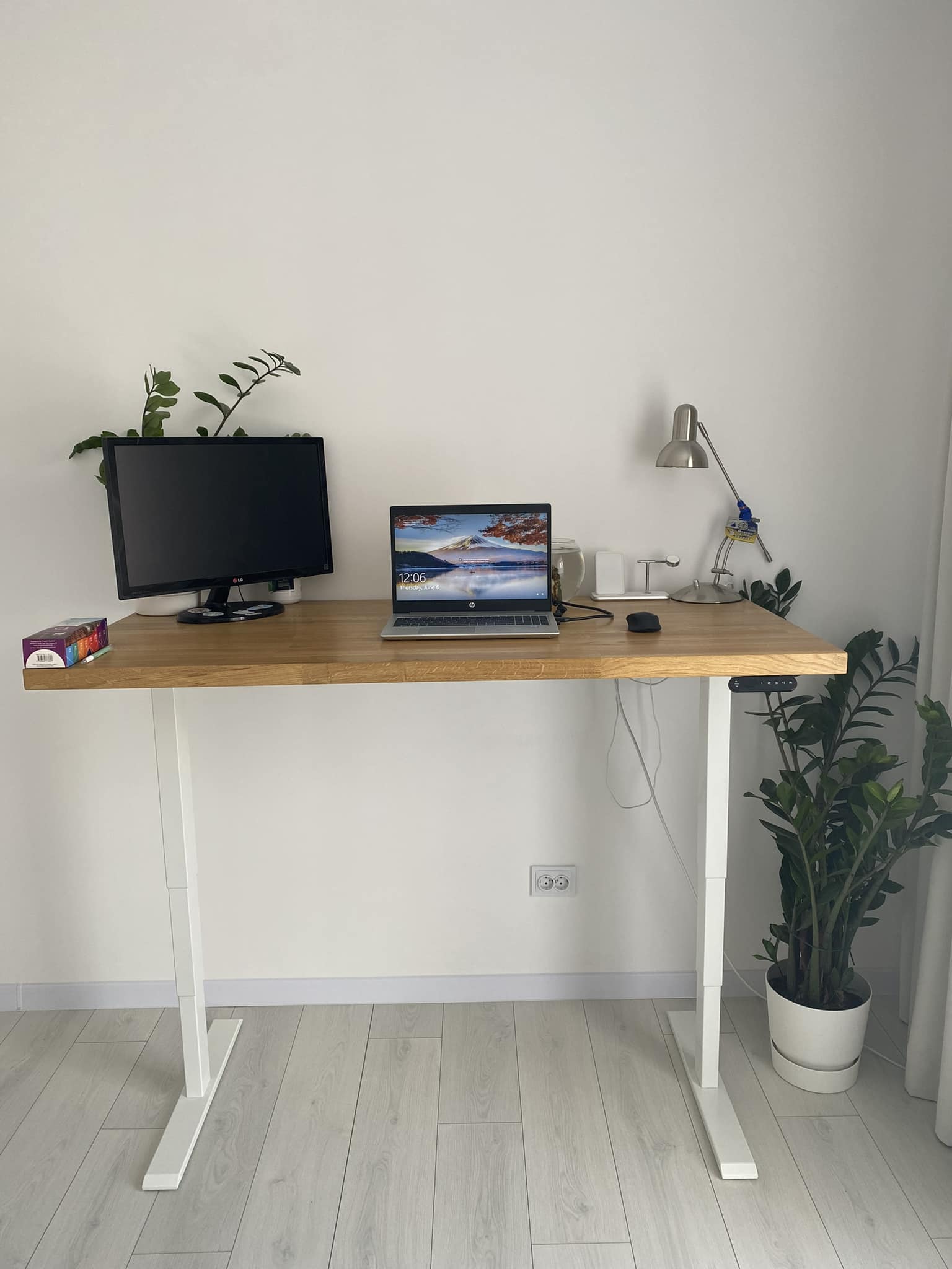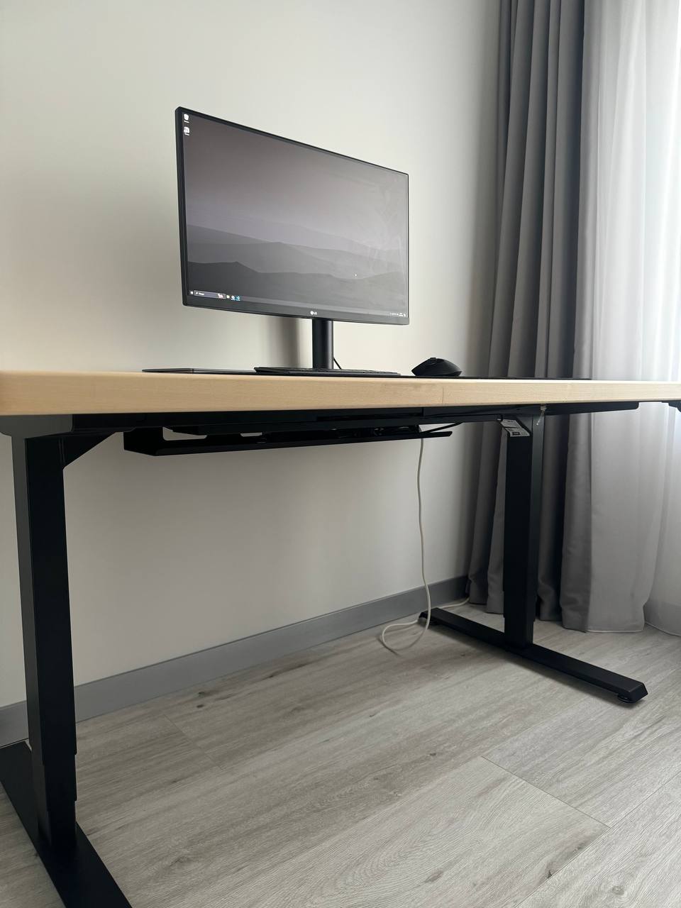 Після декількох тижнів використання можу з упевненістю сказати, що стіл повністю виправдав мої очікування. Його робоча поверхня досить простора, щоб розмістити всі необхідні для мене девайси: монітор 27 дюймів, ноутбук, акустику, а також залишити місце для дрібниць і документів. При цьому все залишається зручно доступним, без відчуття перевантаженості. Міцність і стабільність конструкції приємно здивували — навіть під час активної роботи стіл залишається нерухомим. Поверхня виглядає дуже естетично й приємна на дотик, що додає комфорту під час роботи.
