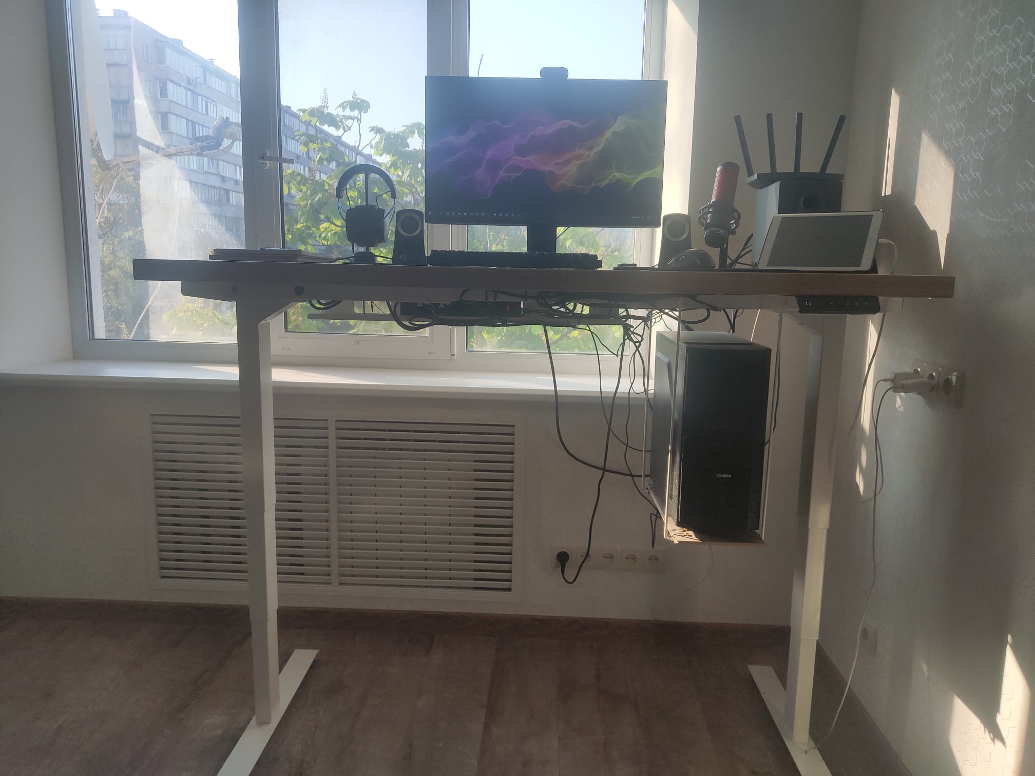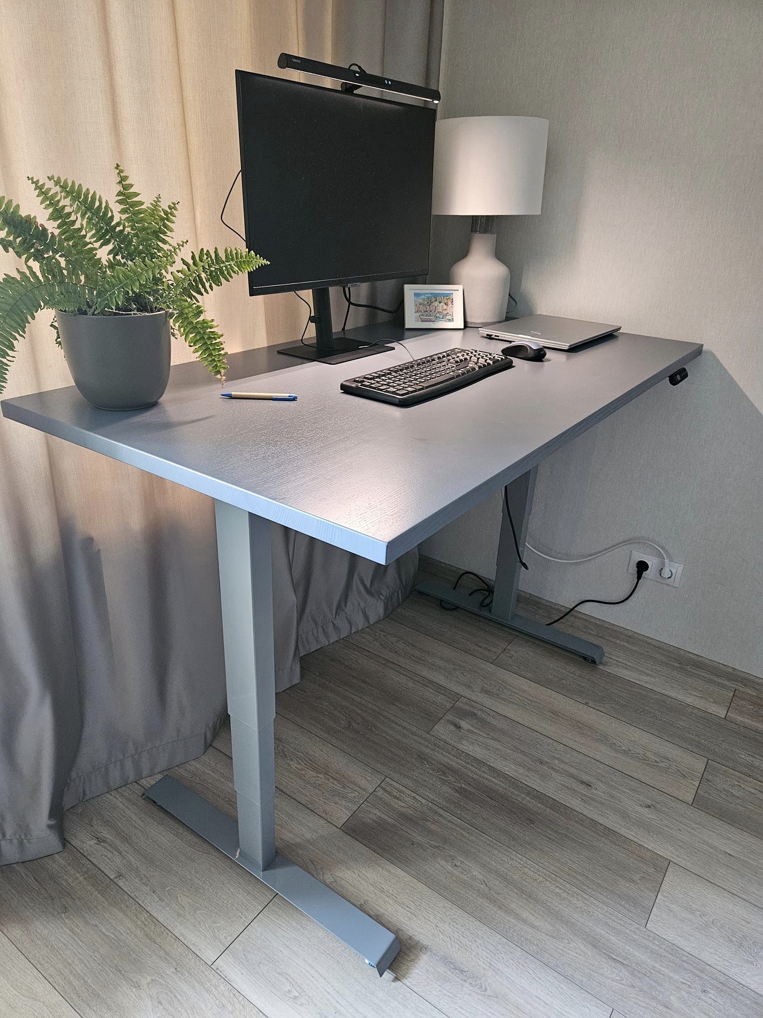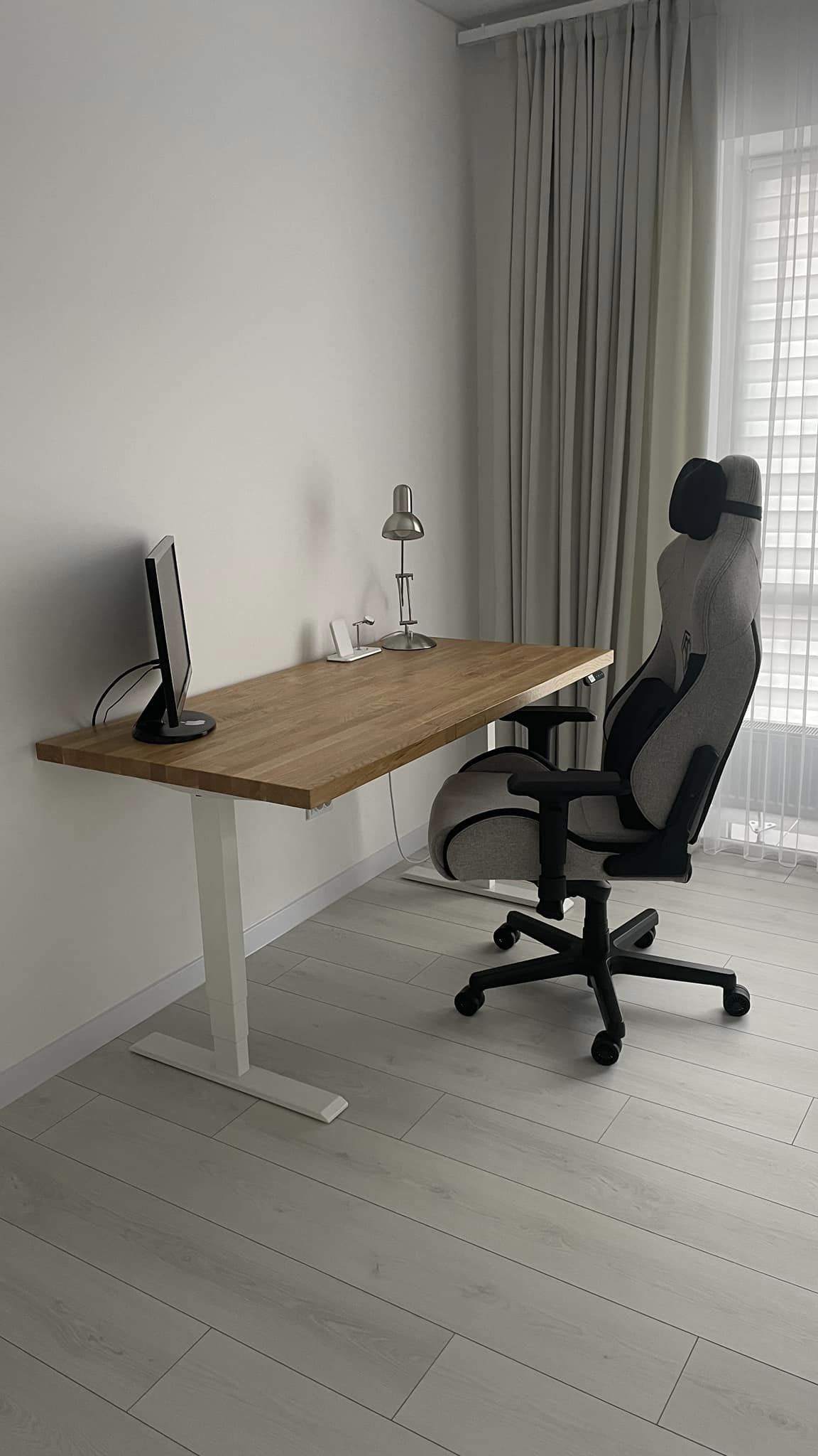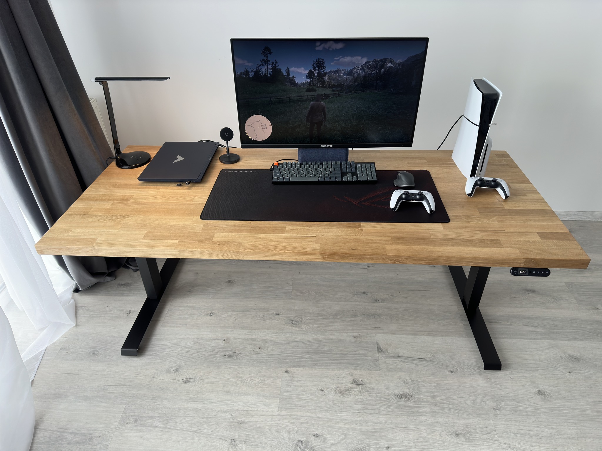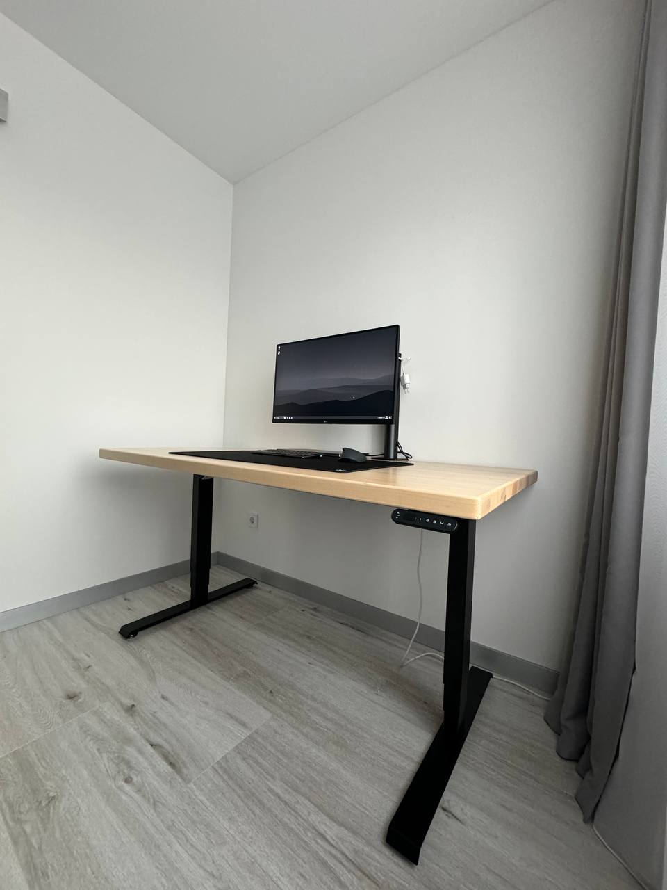 Після декількох тижнів використання можу з упевненістю сказати, що стіл повністю виправдав мої очікування. Його робоча поверхня досить простора, щоб розмістити всі необхідні для мене девайси: монітор 27 дюймів, ноутбук, акустику, а також залишити місце для дрібниць і документів. При цьому все залишається зручно доступним, без відчуття перевантаженості. Міцність і стабільність конструкції приємно здивували — навіть під час активної роботи стіл залишається нерухомим. Поверхня виглядає дуже естетично й приємна на дотик, що додає комфорту під час роботи.