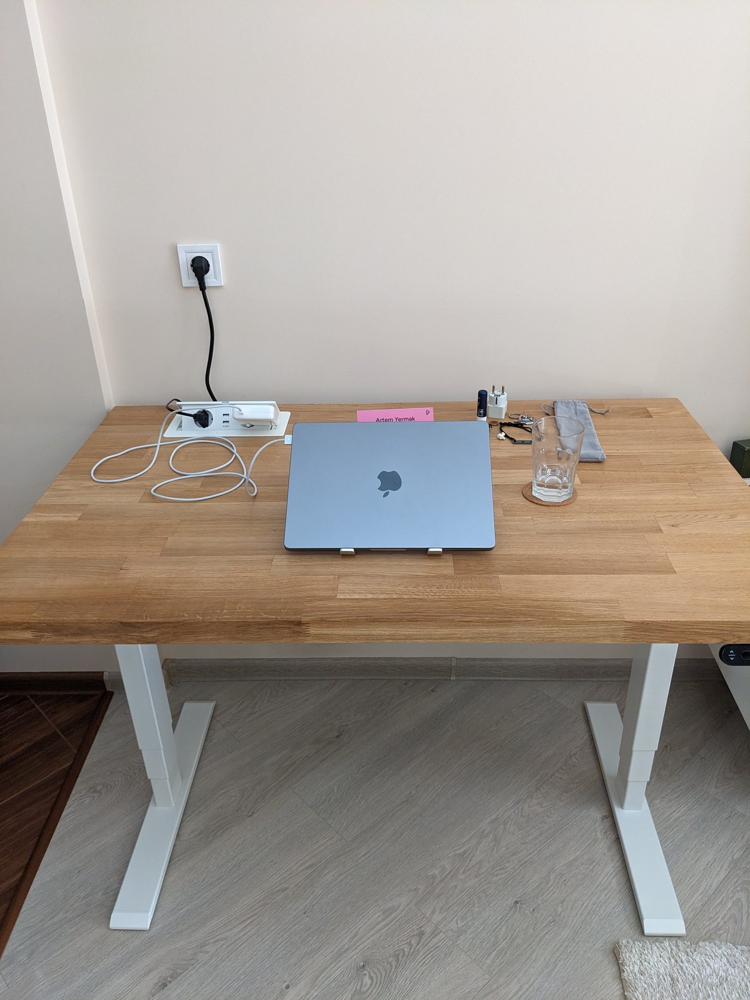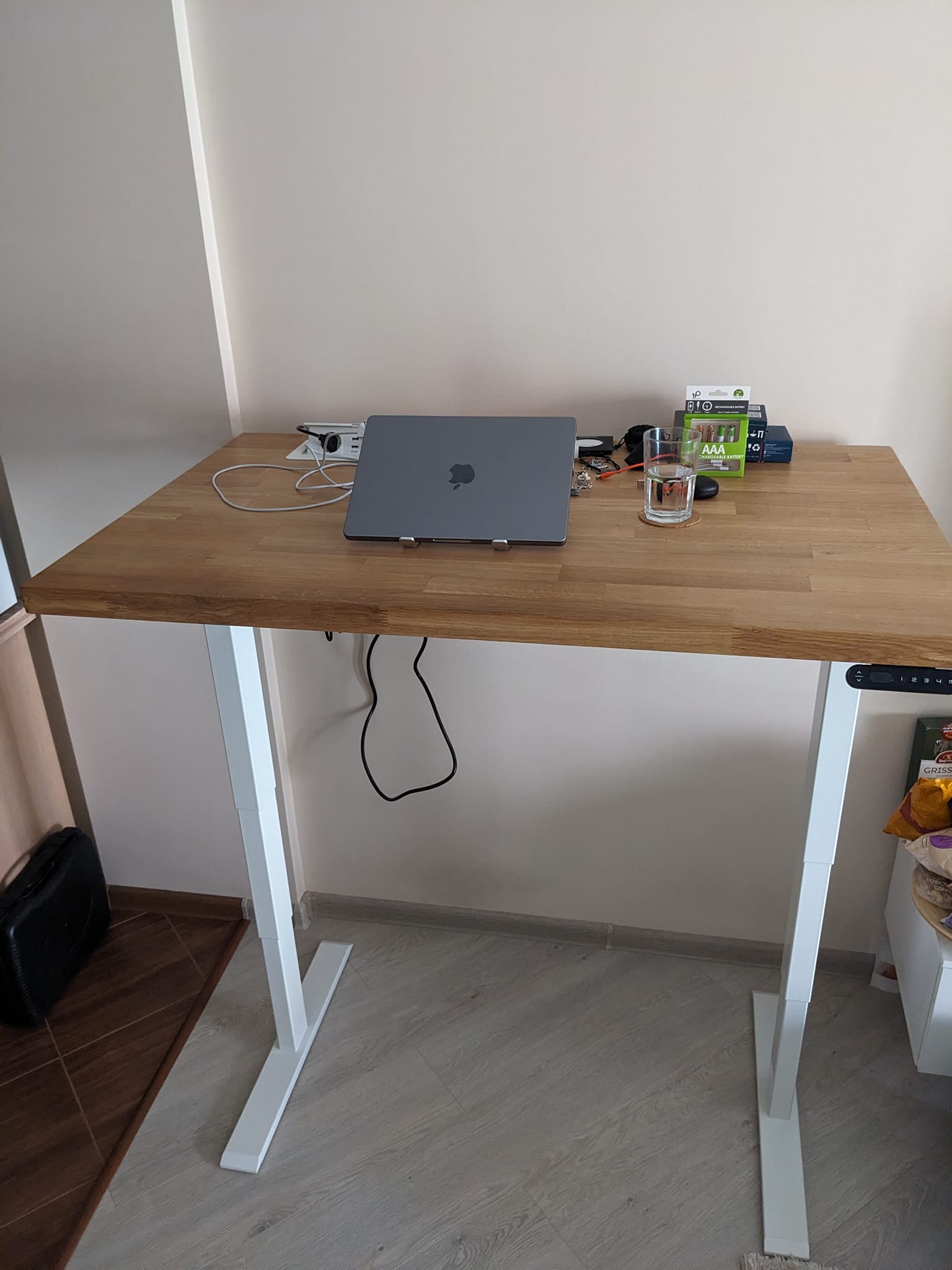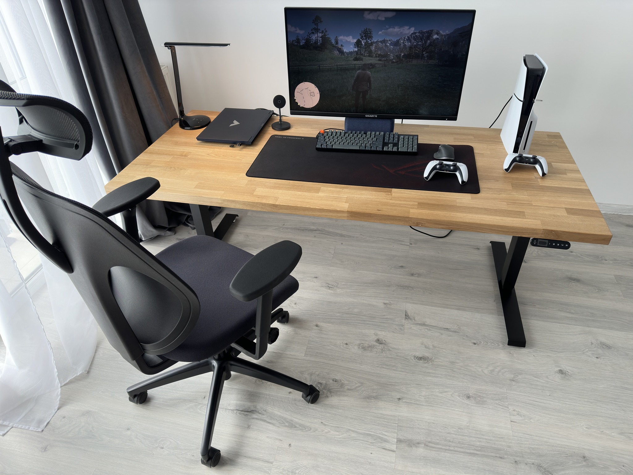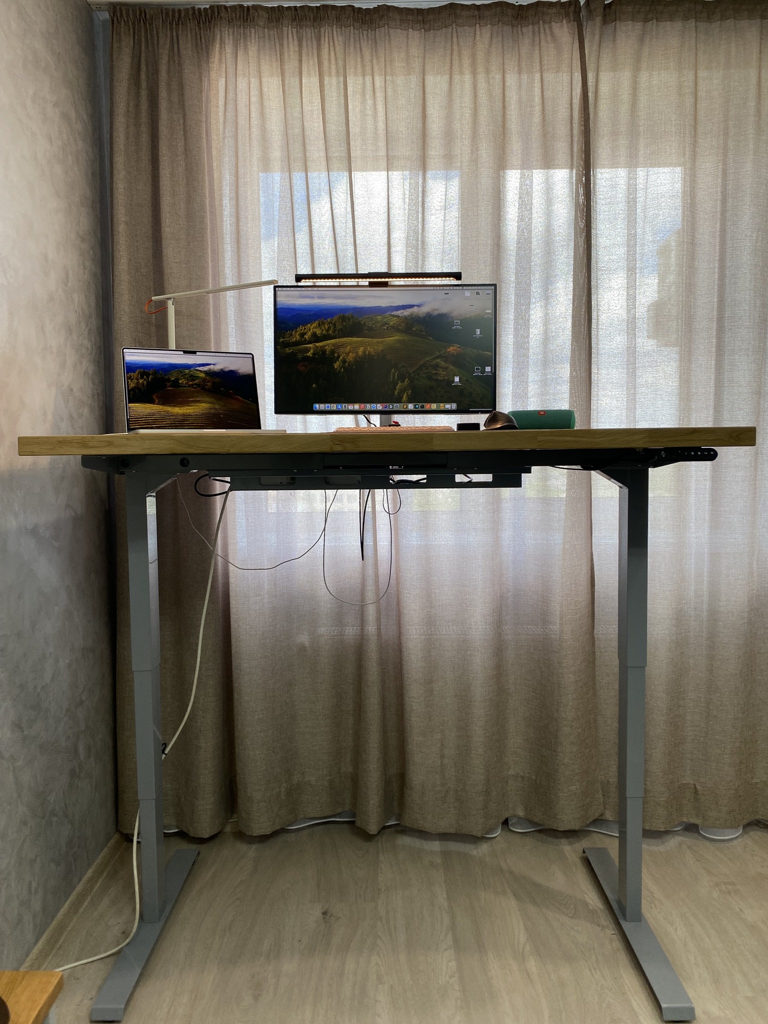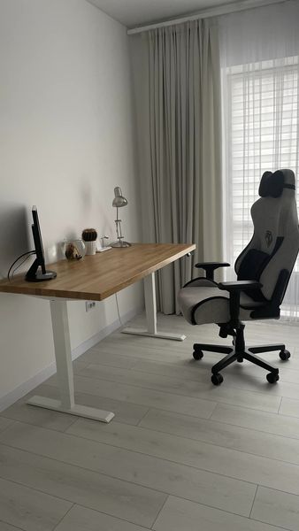Після декількох тижнів використання можу з упевненістю сказати, що стіл повністю виправдав мої очікування. Його робоча поверхня досить простора, щоб розмістити всі необхідні для мене девайси: монітор 27 дюймів, ноутбук, акустику, а також залишити місце для дрібниць і документів. При цьому все залишається зручно доступним, без відчуття перевантаженості. Міцність і стабільність конструкції приємно здивували — навіть під час активної роботи стіл залишається нерухомим. Поверхня виглядає дуже естетично й приємна на дотик, що додає комфорту під час роботи.