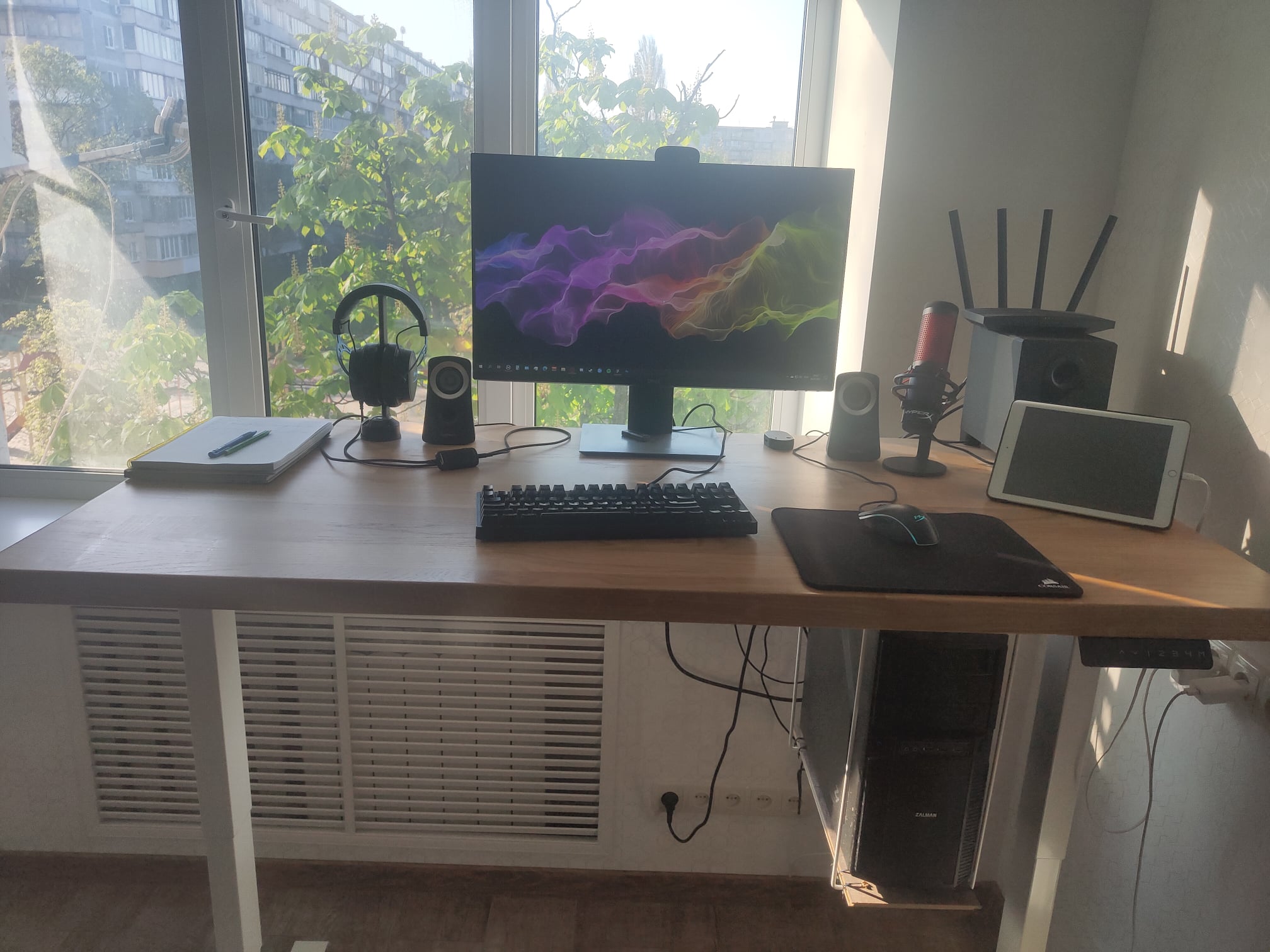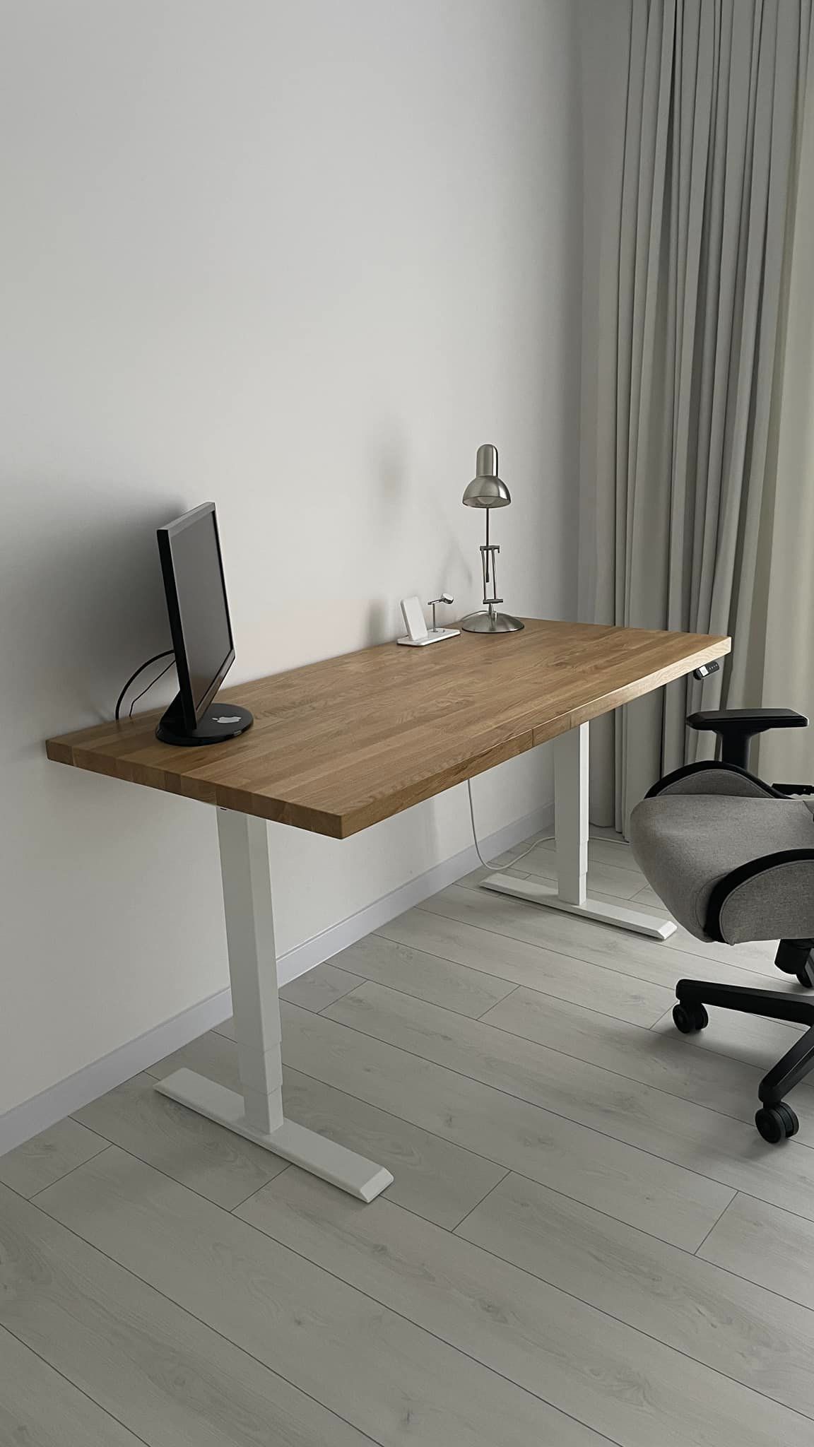 Ідеально вписався в інтер‘єр. Масивні стійки, могутня дубова стільниця додають непохитності і впевненості в роботі. Замовив додатково T-виріз і органайзер для кабелів – дозволяють сховати весь «дротовий безлад». Стільницю взяв ширшу (800-ку), люблю коли на столі багато місця. Дуже переймався за якість поверхні (хотілось максимально відчувати дерево), та зараз можу з впевненістю сказати, що задоволений на всі 100%. Для тих, в кого багато статичної роботи – ідеальний варіант.