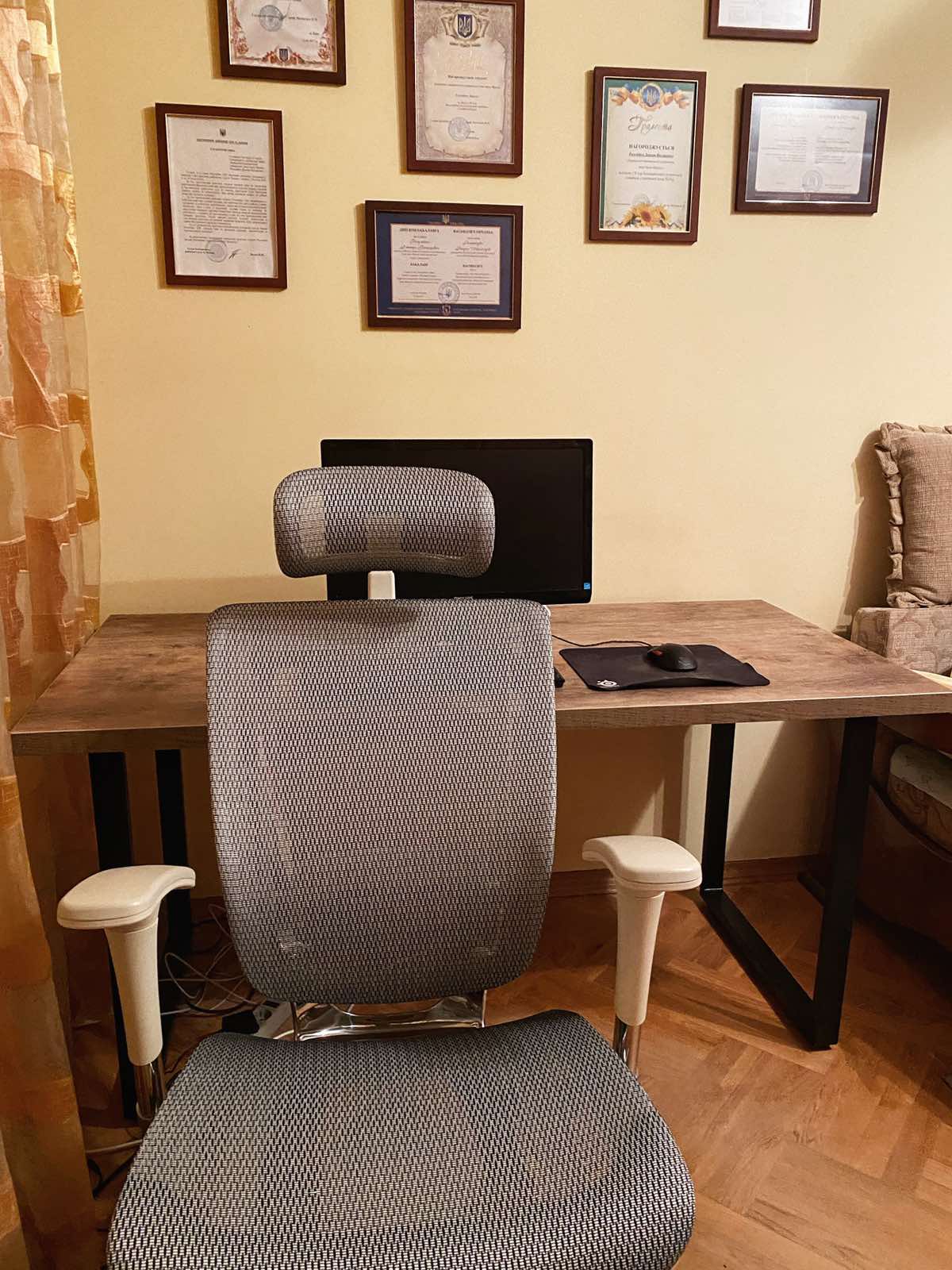 Крісло – Profim Light Up, проста модель за адекватну ціну, але в ній можна максимально зручно відрегулювати все під себе. Дуже класно, що можна приїхати в шоурум потестувати все на місці і обрати не просто по вигляду в інтернеті.