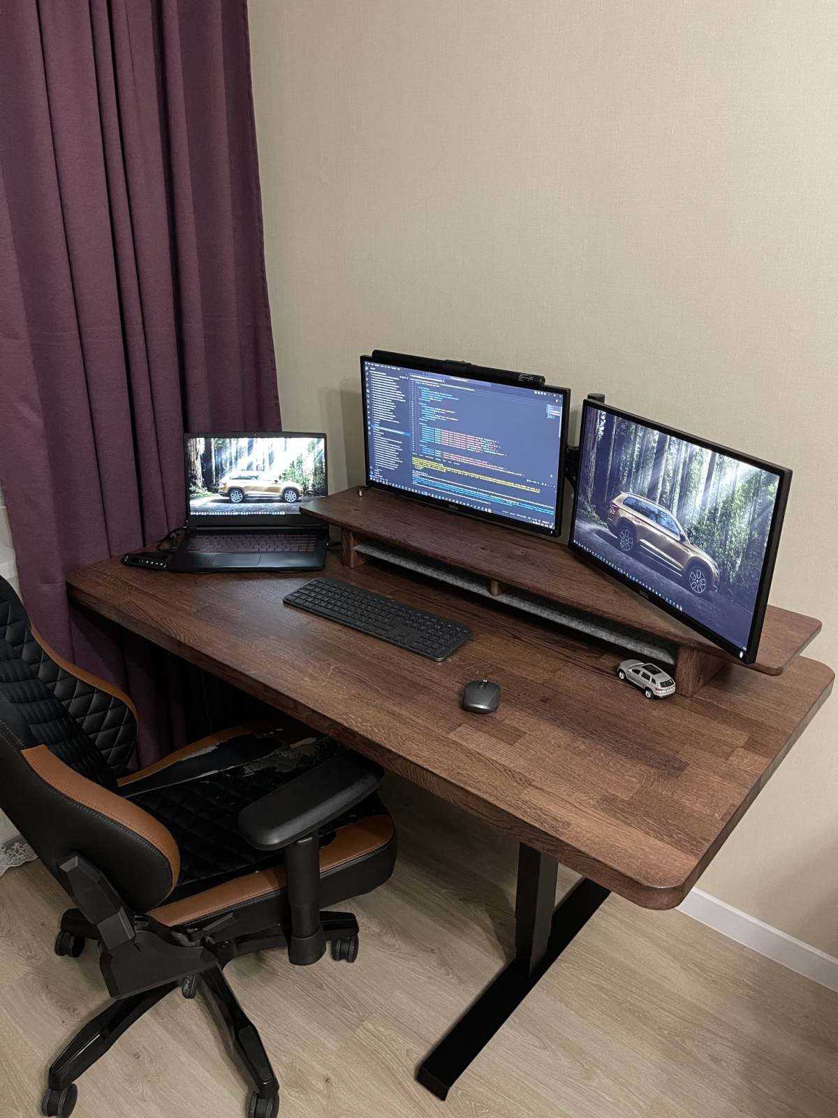Ідеально вписався в інтер‘єр. Масивні стійки, могутня дубова стільниця додають непохитності і впевненості в роботі. Замовив додатково T-виріз і органайзер для кабелів – дозволяють сховати весь «дротовий безлад». Стільницю взяв ширшу (800-ку), люблю коли на столі багато місця. Дуже переймався за якість поверхні (хотілось максимально відчувати дерево), та зараз можу з впевненістю сказати, що задоволений на всі 100%. Для тих, в кого багато статичної роботи – ідеальний варіант.